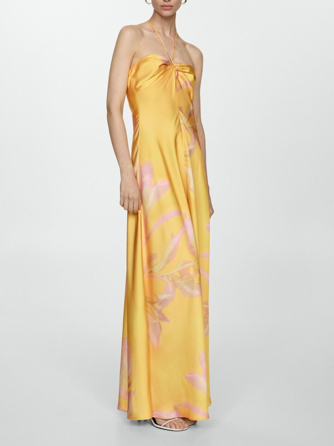 This maxi dress is made from flowy fabric and features a vibrant yellow background adorned with printed design patterns.