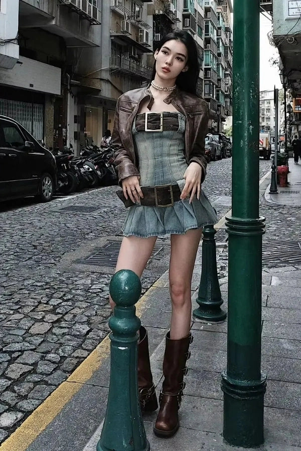 Command attention in our Harlow Denim Corset. This unique piece features a deconstructed denim design with bold buckle detailing. creating a look that's both edgy and fashion-forward. The corset style cinches the waist for a flattering silhouette. while the industrial hardware adds a touch of rebellious attitude. Perfect for making a statement. this top is ideal for concerts. festivals. or any occasion where you want to unleash your inner warrior. Make a lasting impression with the Harlow Denim Corset.