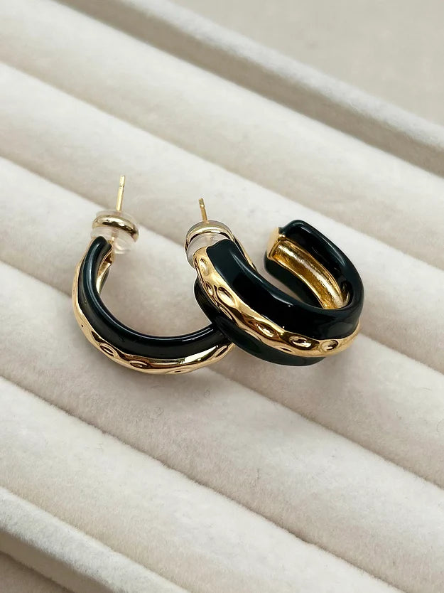 Crafted from copper and plated with 18K gold. these earrings feature a beautiful enamel inlay. combining timeless charm with modern elegance. The perfect balance of classic design and refined craftsmanship. they add a sophisticated touch to any ensemble.