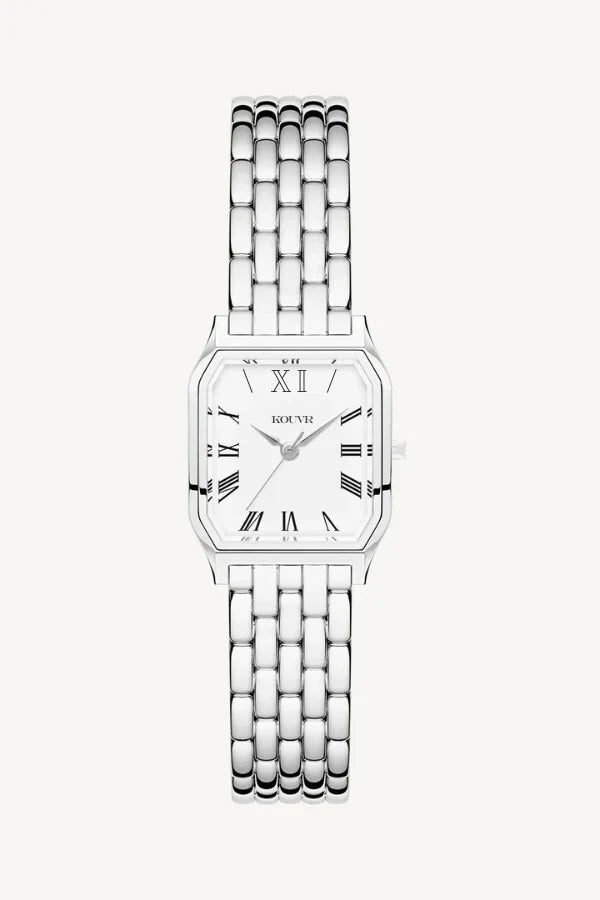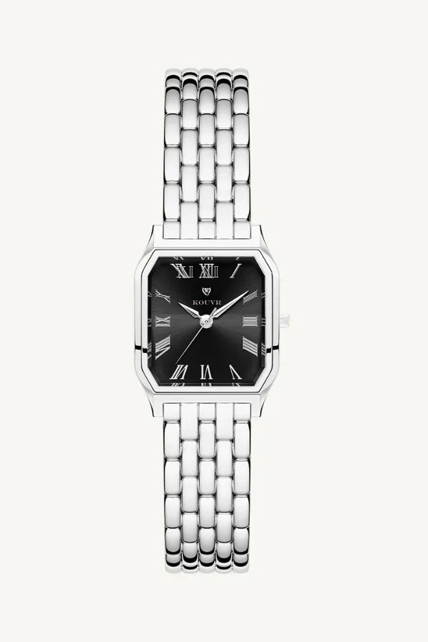 Encased in a beautifully contoured frame. the watch showcases an elegant white dial. accentuated by bold black Roman numerals. This striking contrast creates a visually captivating display. ensuring clarity and sophistication. The gold hands glide gracefully across the dial. enhancing the watch's opulent aesthetic while delivering precision in every tick.