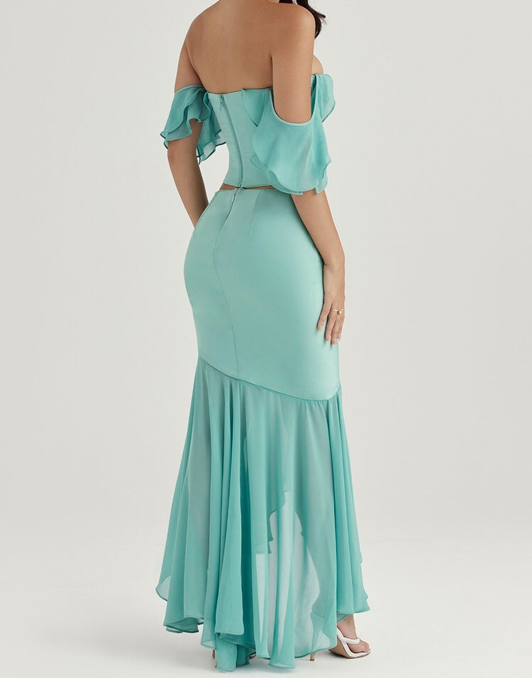 The 'Lila' Jade Ruffle Maxi Skirt is cut from lustrous jade stretch satin and floaty georgette that skims effortlessly over the hips and flows beautifully across the body.