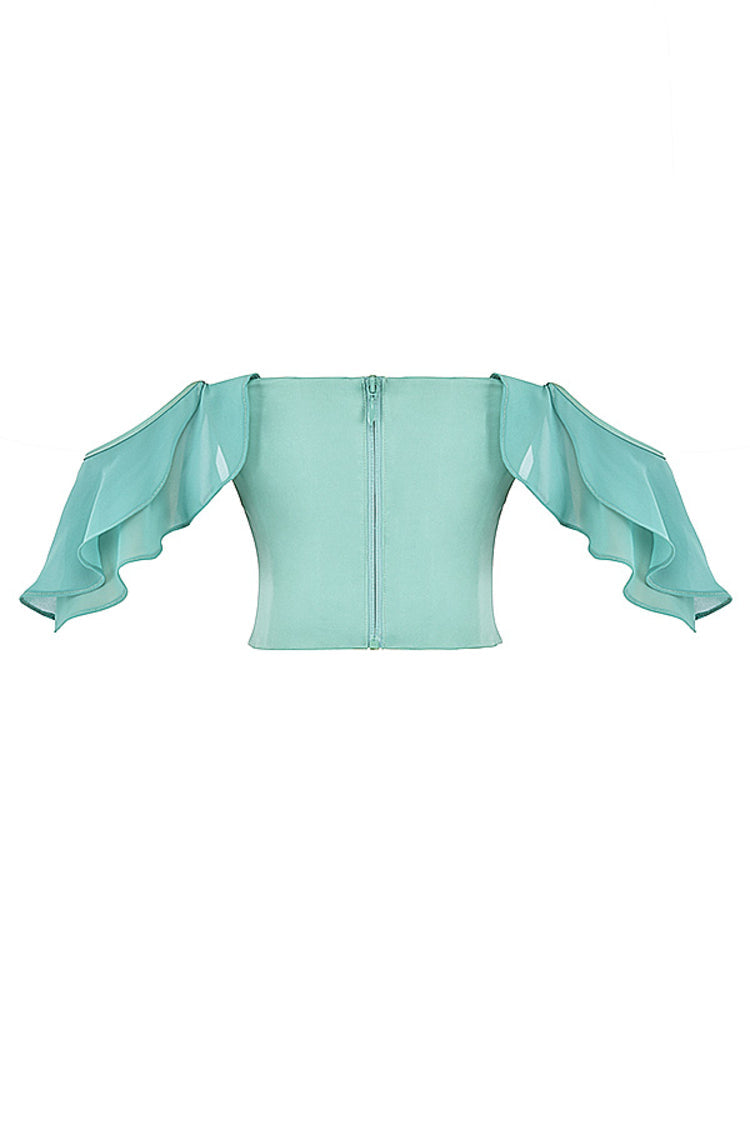 The 'Isabella' Jade Ruffle Sleeve Corset features a sweetheart neckline. supported by lightly padded underwired cups to showcase the bust.