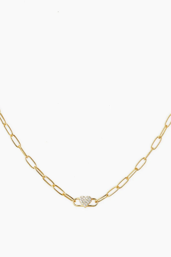 Radiate elegance with the Jolene Gold Necklace. Featuring a sophisticated paperclip design highlighted by a sparkling heart motif. this necklace is the perfect way to add a touch of sweetness to your daily stack of jewelry.