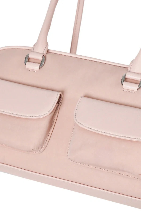 Crafted from lightweight nylon with a cotton-filled structure. it boasts a subtle sheen for a touch of elegance. The vintage-inspired handle details are paired with a smooth zipper closure and a secure holder to keep the handles in place. Thoughtfully designed. the bag features two mini flap pockets on the front. an open pocket on the back. and a well-organized interior with two open pockets and one zippered compartment. Perfectly balancing style and functionality. the Karina Chubby Bag is a statement piece for any occasion.