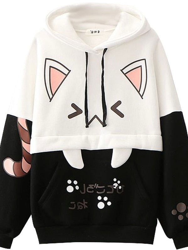 The front of the hoodie showcases a delightful cat face with playful. closed eyes and a small mouth. giving it a charming and mischievous expression.