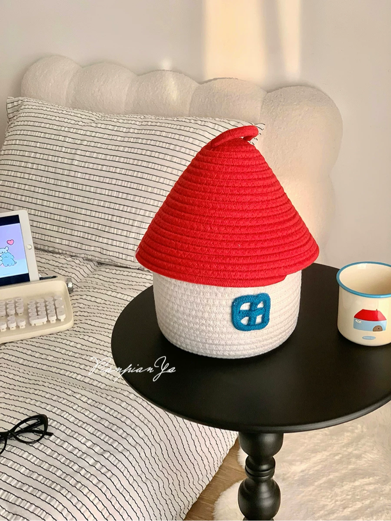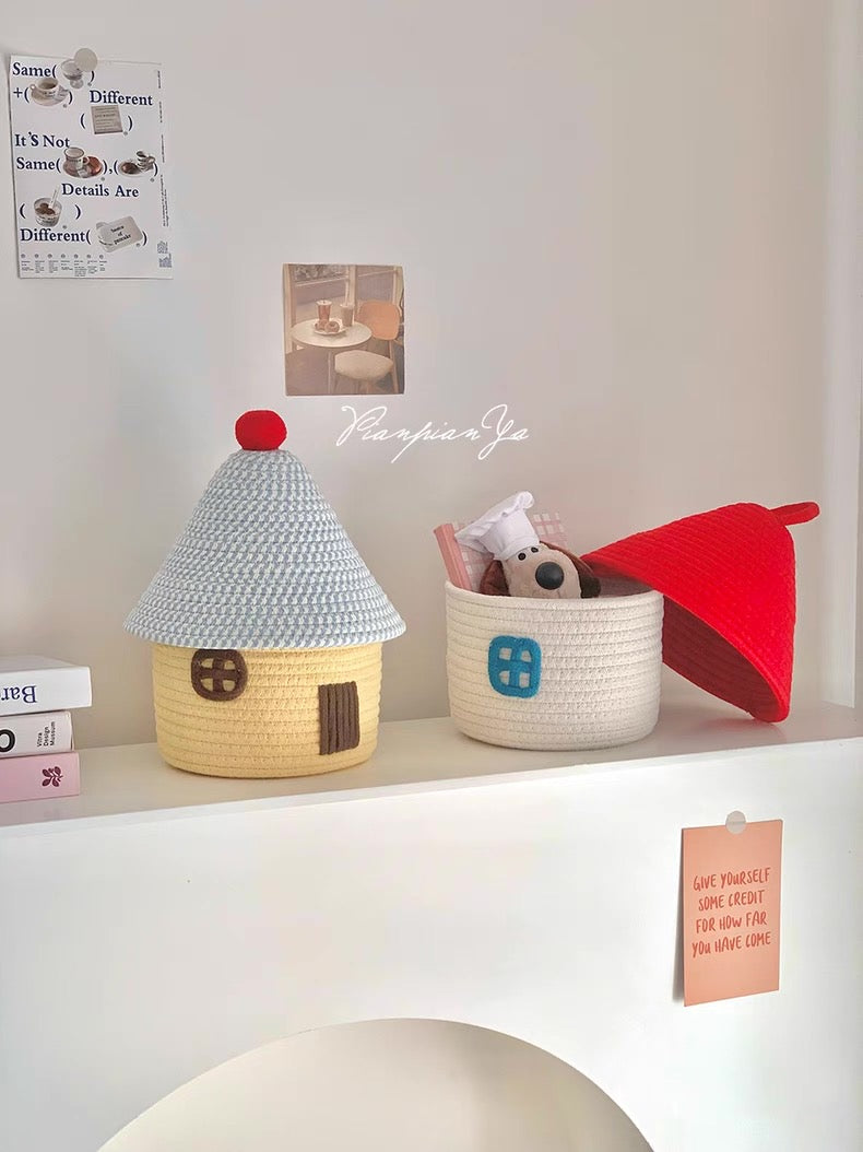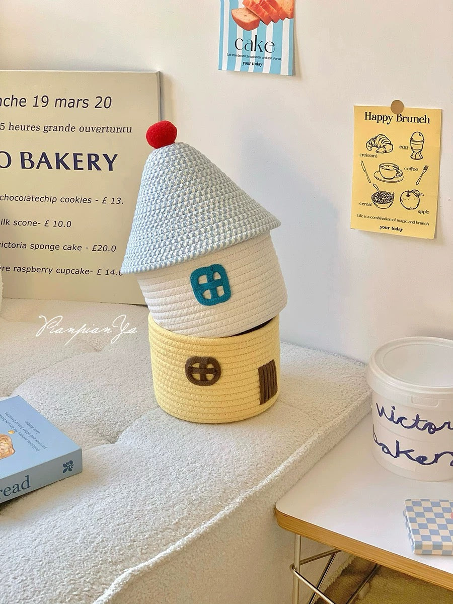 Add charm and functionality to your space with this kawaii house-shaped cotton rope storage basket! Designed in playful pastel tones. this cute organizer doubles as home decor and desktop storage for cosmetics. toys. snacks. or sundries. The woven cotton lid adds a whimsical cottagecore touch. while the soft-yet-sturdy rope construction ensures durability. Perfect for dorm rooms. nurseries. or gift baskets. this adorable bin keeps clutter at bay with style.