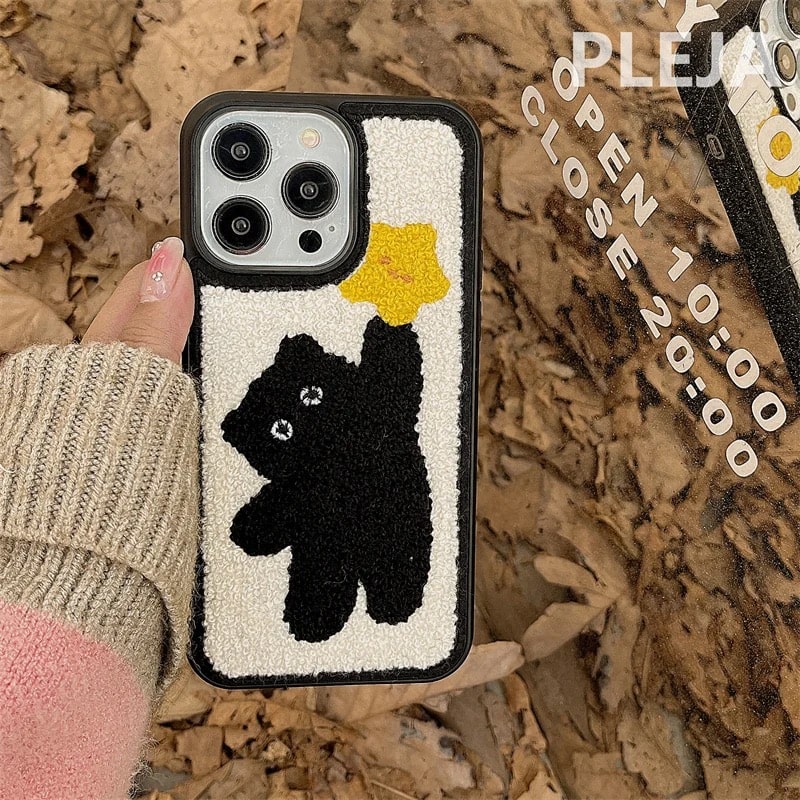 Adorned with an embroidered cartoon cat. this phone cover combines style with functionality. making it the ideal gift for anyone who loves Korean-inspired aesthetics. Perfect for cozy winter days. this plush iPhone case adds charm and warmth to your phone. Designed with precision for a snug fit. it offers complete back and side protection. blending fashion with reliable safety.