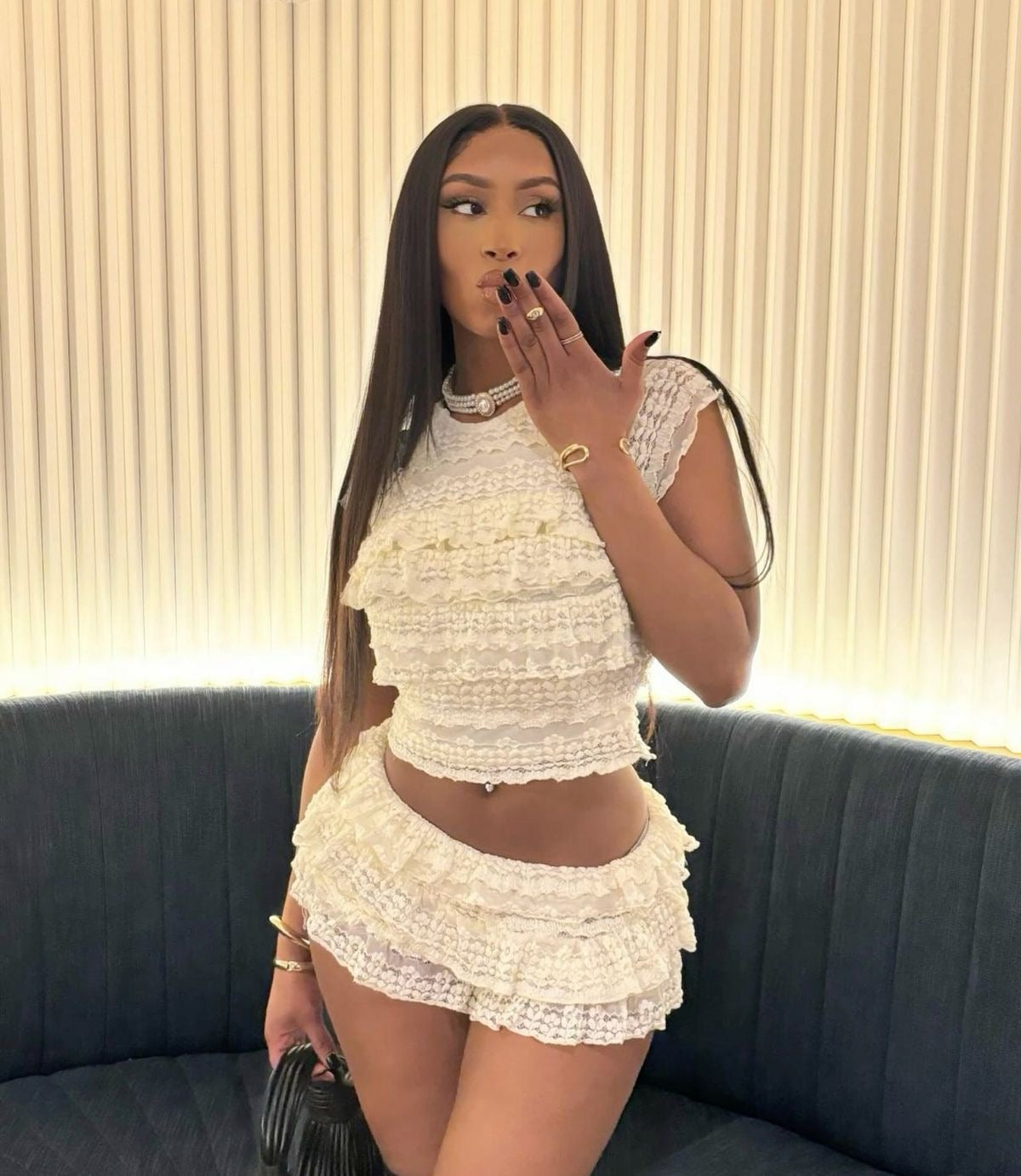 This 2pcs set features a beautifully crafted lace fabric. adorned with delicate ruffles that add a touch of sophistication and femininity.