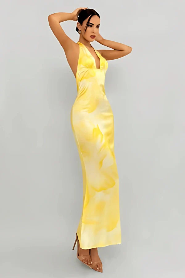 The Luciana Women's Vacation Party Tie-Dye Floral Print Halter Dress is a vibrant and eye-catching piece perfect for summer getaways and special occasions. Designed with a deep V-neckline and a flattering halter silhouette. this dress enhances your curves while offering a breezy. elegant feel. The bold yellow tie-dye floral print adds a touch of tropical charm. while the high slit provides a sultry. flowy movement. Ideal for beach parties. vacations. or warm-weather celebrations.