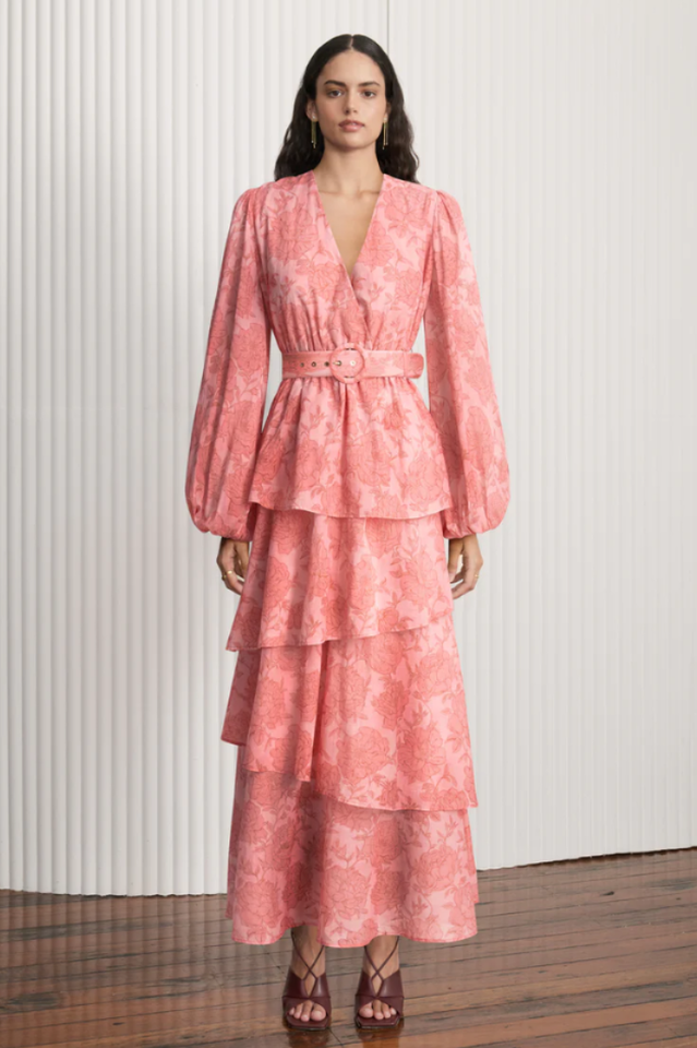 Crafted from a luxuriously light cotton fabrication. this gown features voluminous sleeves. a voluminous ruffled skirt. self covered buckle belt. and an invisible zip closure for a fit that drapes elegantly.