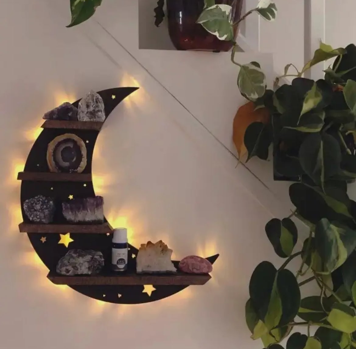 The elegant moon phase design and geometric structure add a touch of magic to any room. creating an enchanting focal point for celestial decor enthusiasts. Ideal for living rooms. meditation spaces. or as a unique gift. this shelf harmonizes with various decor styles. from boho to gothic. Whether used as a witch shelf. wiccan altar shelf. or simple moon wall art. the Luna Wood Shelf beautifully blends functionality with artistry. elevating the aesthetic of any space.