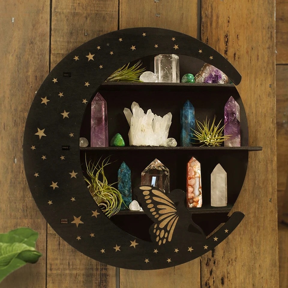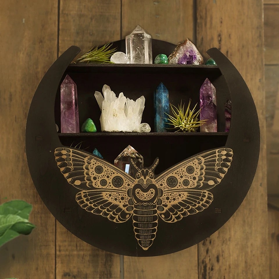 Transform your space with the Luna Wood Shelf. a unique crescent moon and luna moth-inspired crystal shelf designed for those who love celestial and wiccan decor. Handcrafted from high-quality wood. this Luna Moth shelf offers ample space to display crystals. candles. or other cherished items. making it perfect as an altar shelf. bedroom accent. or spiritual decor piece.