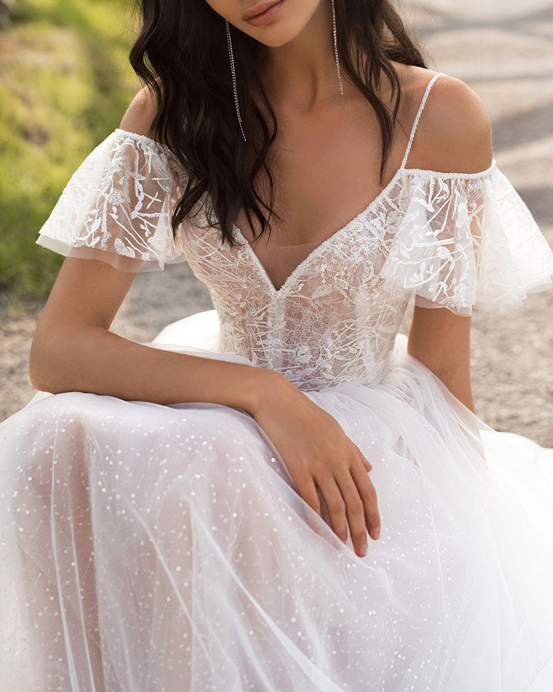 The tulle draped off the shoulder embroidery lace bridesmaid dress ball gown features handmade embroidery. sheer mesh embroidered lace. v neck. off the shoulder. floor-length tulle prom dress and fitted most bust sizes.