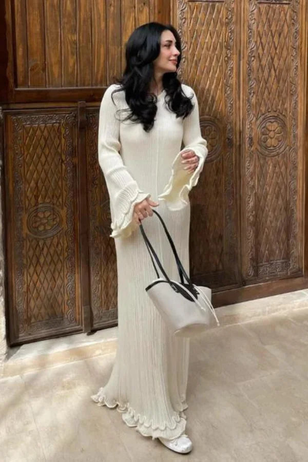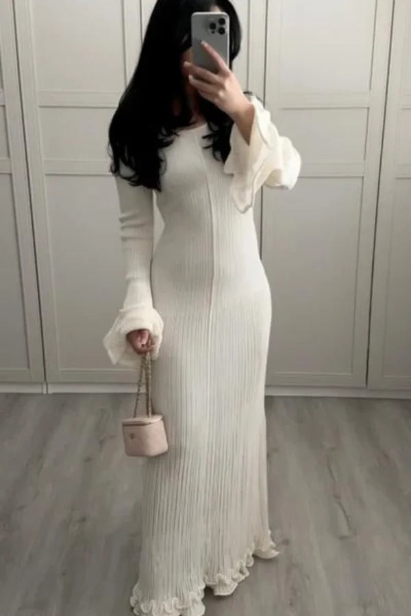 Introducing our Madeline Dress. a beautifully fitted. long-length piece crafted from a luxurious soft rib knit blended with linen for a touch of elegance. This dress features a graceful round neckline and an alluring deep-cut back with spaghetti ties that cross and fasten at the neck. creating a sophisticated look. The design is completed with long trumpet sleeves and a gently flared skirt. enhanced by double-layered frill trims with delicately rolled edges at the cuffs and hem. Perfect for a touch of refined charm and effortless style.