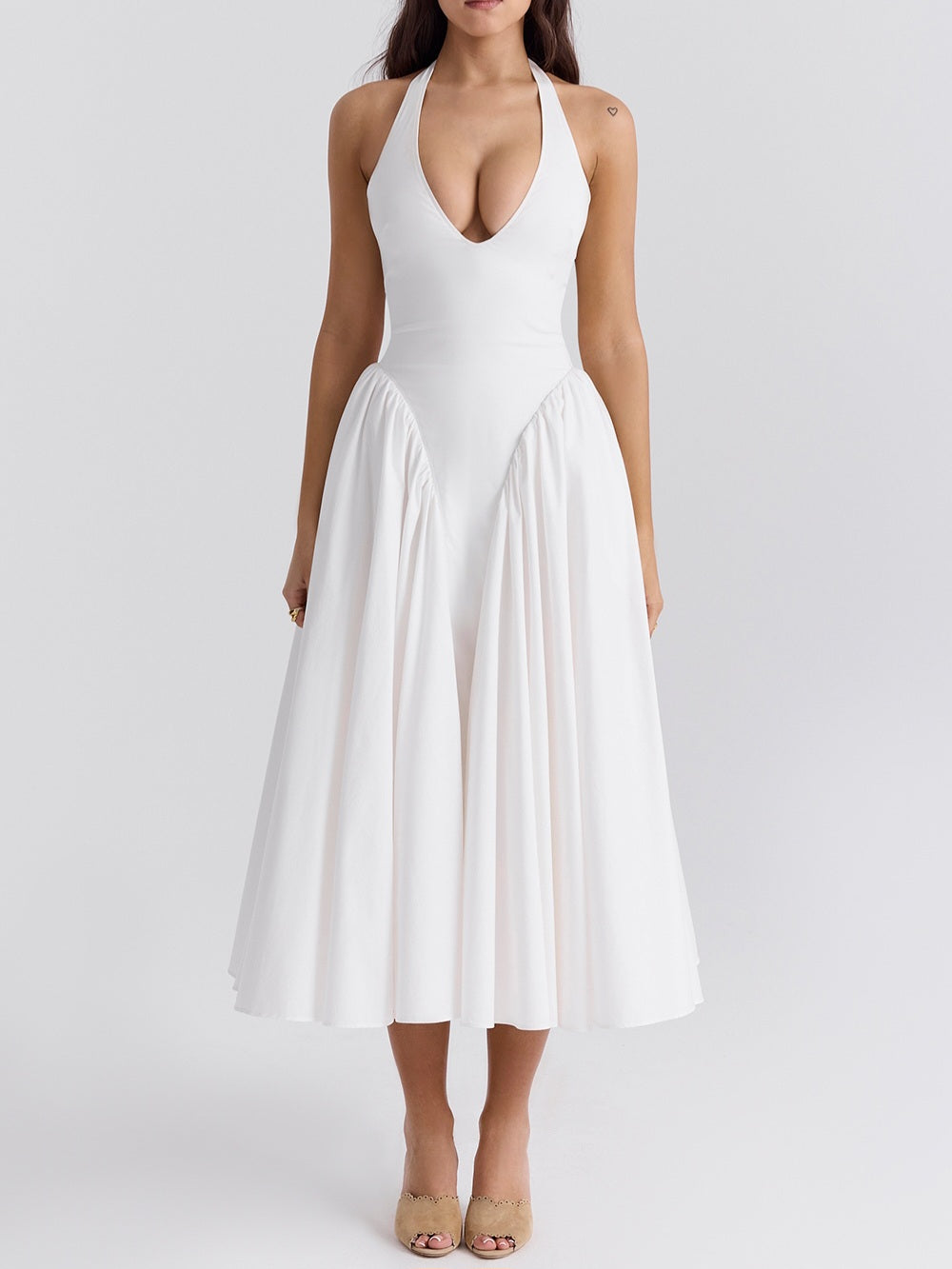 This sundress has a fitted bodice. The plunge halter neckline ties beautifully in a bow showcasing the open back.