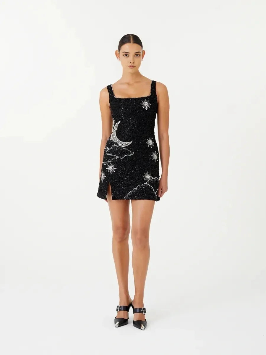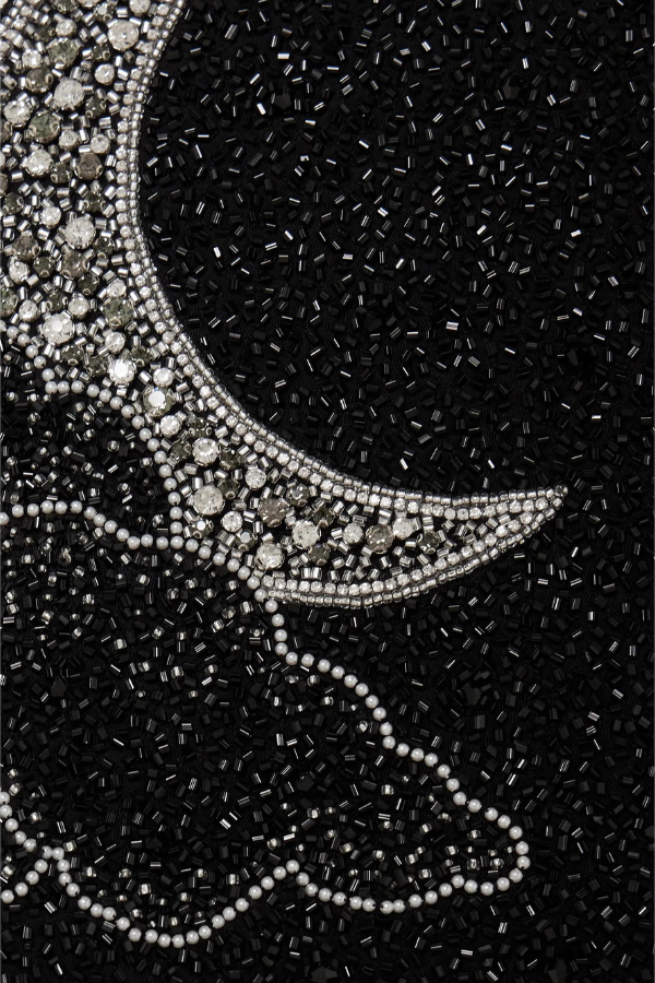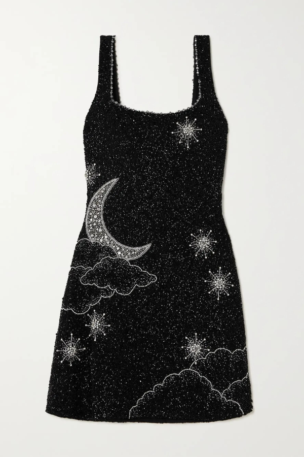 Designed in the brand's signature silhouette. this loose-fitting dress is hand-painted with glittering stars and moons and embellished with luxurious Swarovski beads and crystals. The four-way stretch mesh skirt lets you move effortlessly on the dance floor. make 3 short features