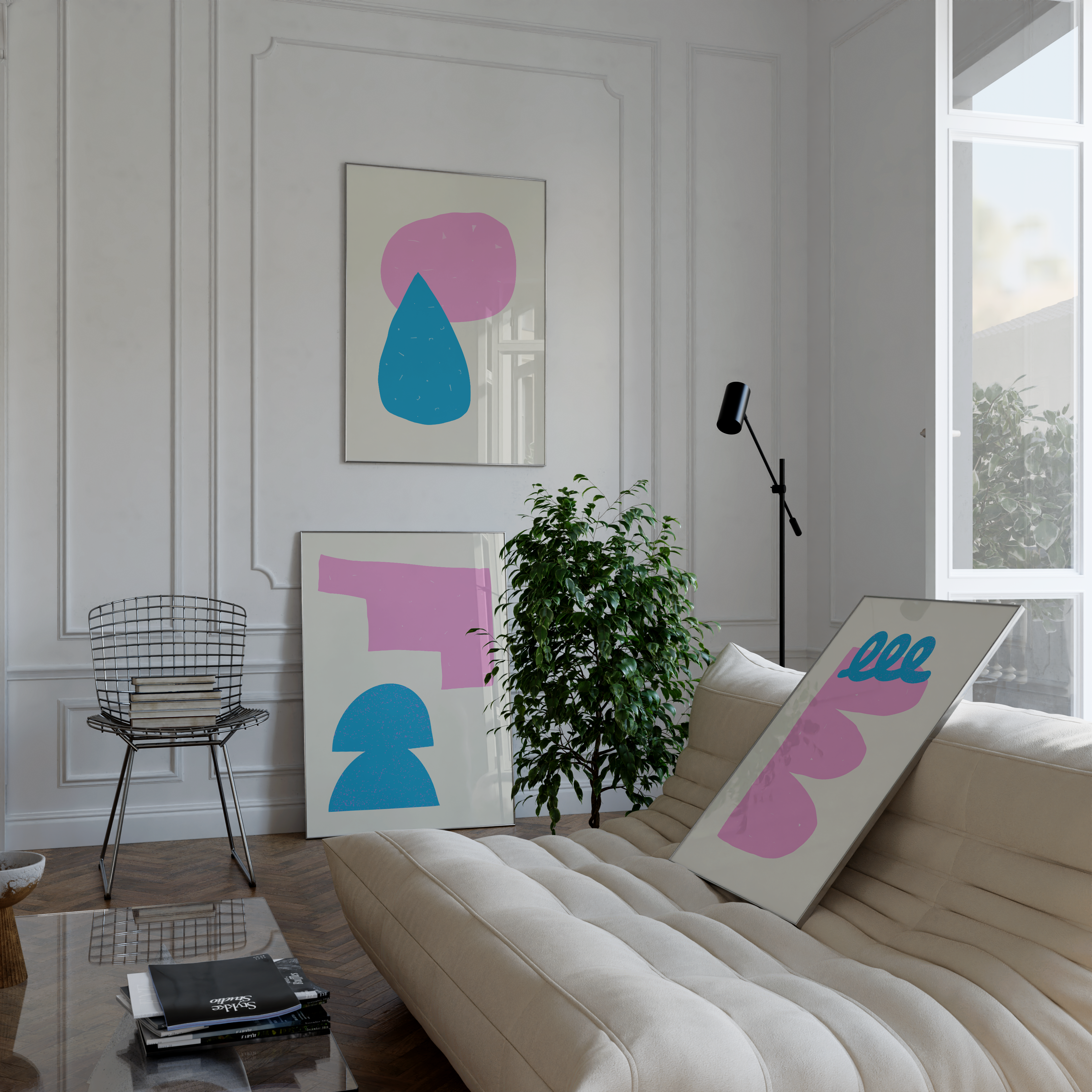 Transform your space with this minimalist abstract wall art set. featuring bold pink and blue geometric shapes. Designed for modern interiors. this 3-piece digital download brings a pop of color and dopamine energy to any room. from aesthetic dorms to creative studios.
