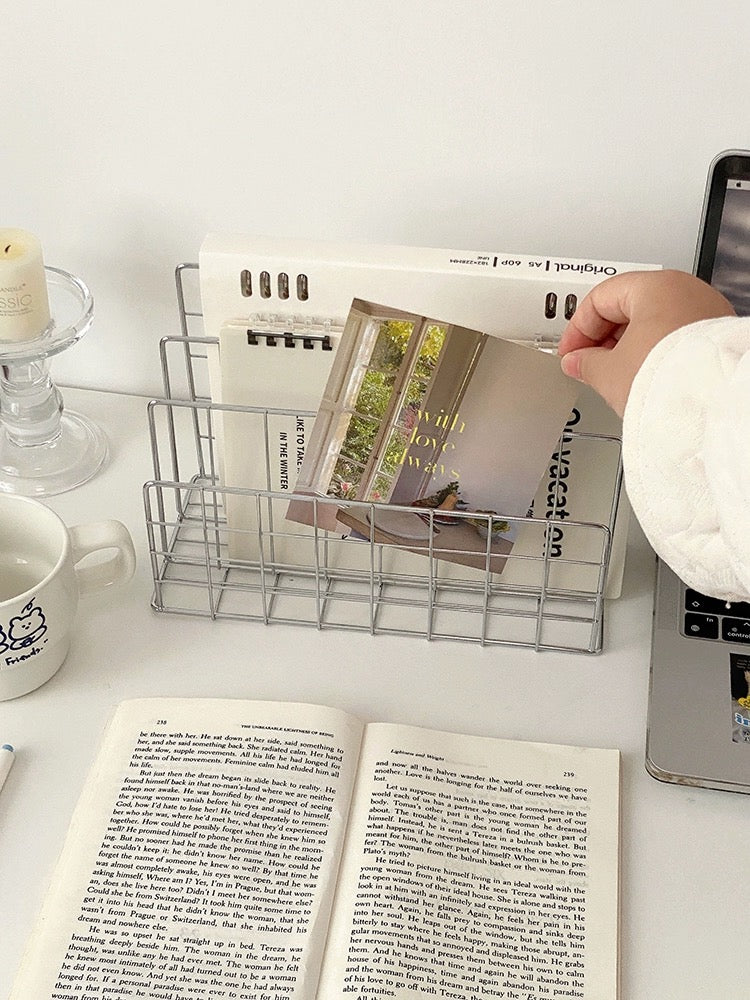 Streamline your workspace with the Minimalist Iron Desktop Storage Rack. This modern. polished metal organizer offers a chic and practical solution for organizing books. files. magazines. and office documents. Perfectly suited for home offices. living rooms. or bedrooms. its sleek design combines function with style. making it a versatile addition to any decor.