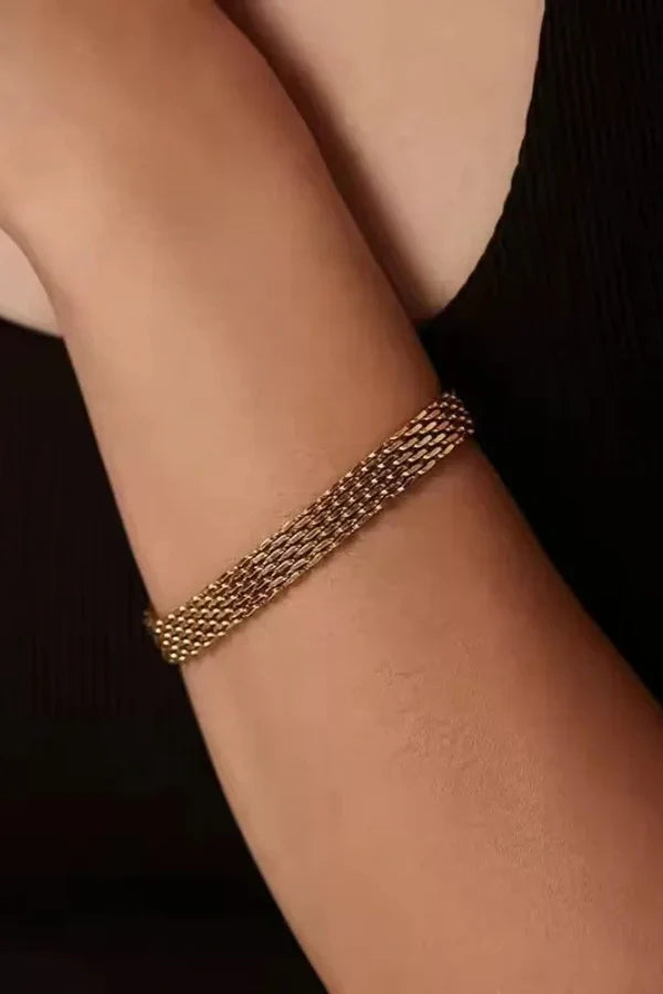 This refined gold-plated bracelet features a delicate layered chain design. exuding timeless sophistication. It is secured with a sturdy lobster clasp and includes an adjustable extension chain. ensuring a perfect fit. Ideal for complementing both formal attire and everyday looks with a touch of understated elegance.