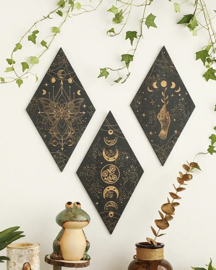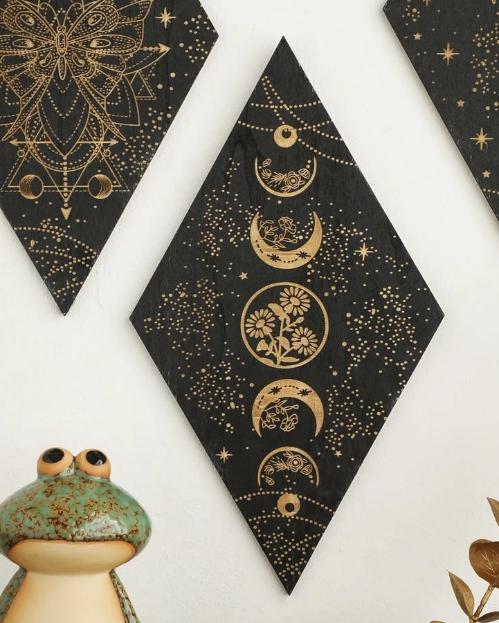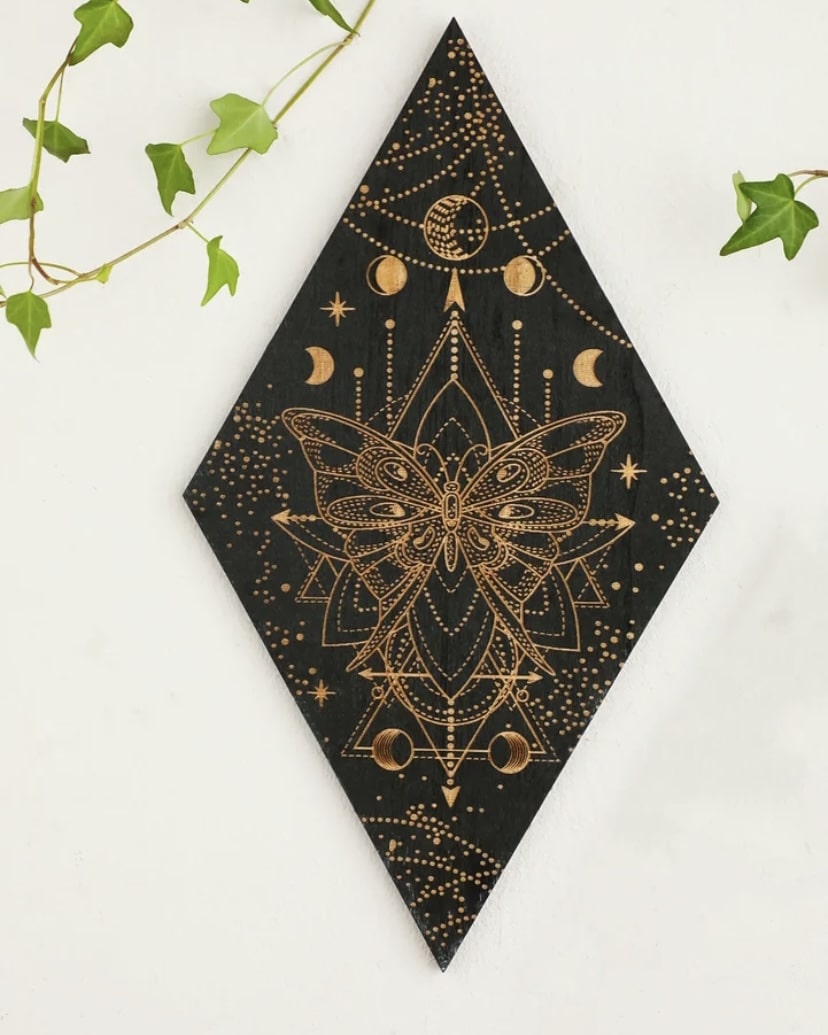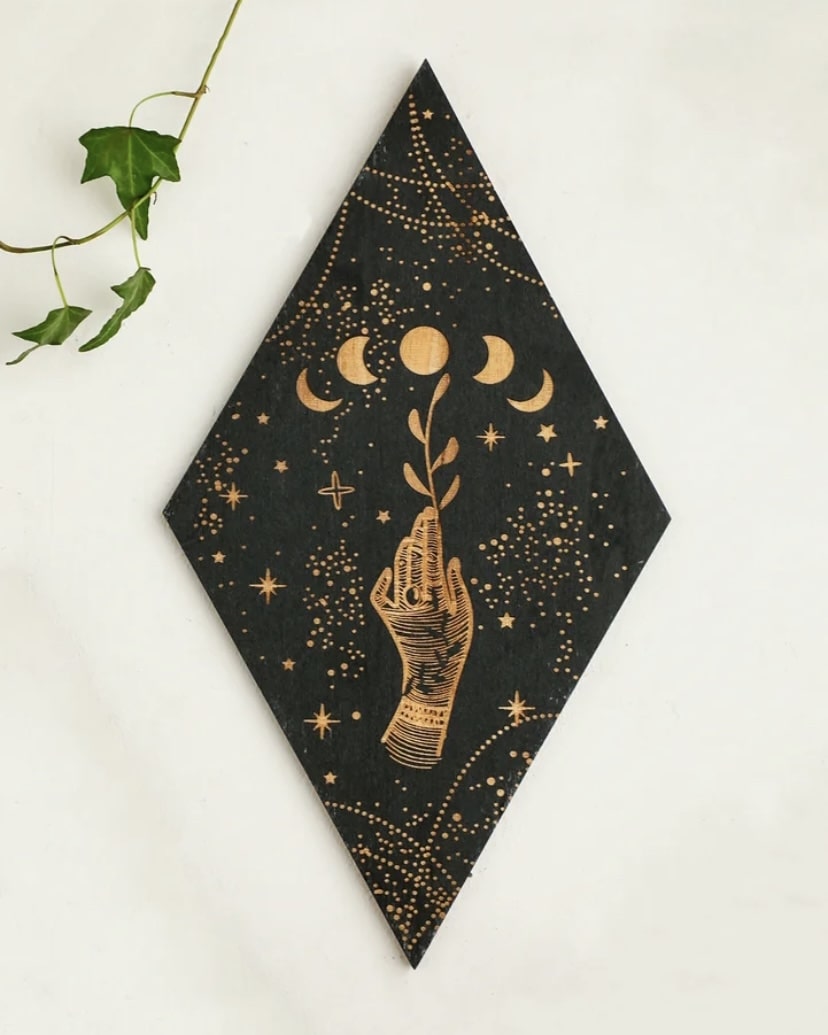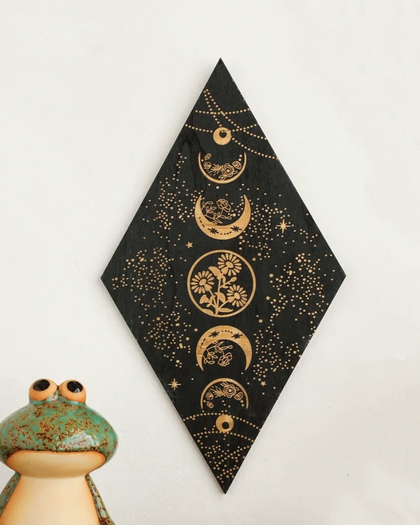 Enhance your space with this Moon Phase Wall Decor. a captivating piece for those who love witchy room decor or boho aesthetics. Crafted from high-quality wood. this black moon phase wall art features intricate details that evoke a tarot-inspired design. perfect for creating a mystical atmosphere. Its rhomboid geometric shape adds a unique touch to any room. whether it's a witch bedroom. living room. or meditation space.