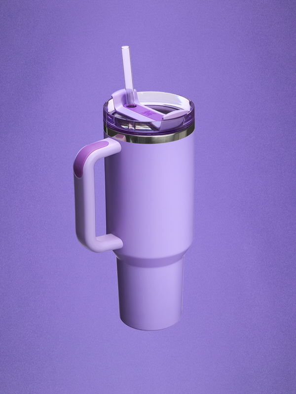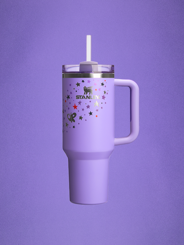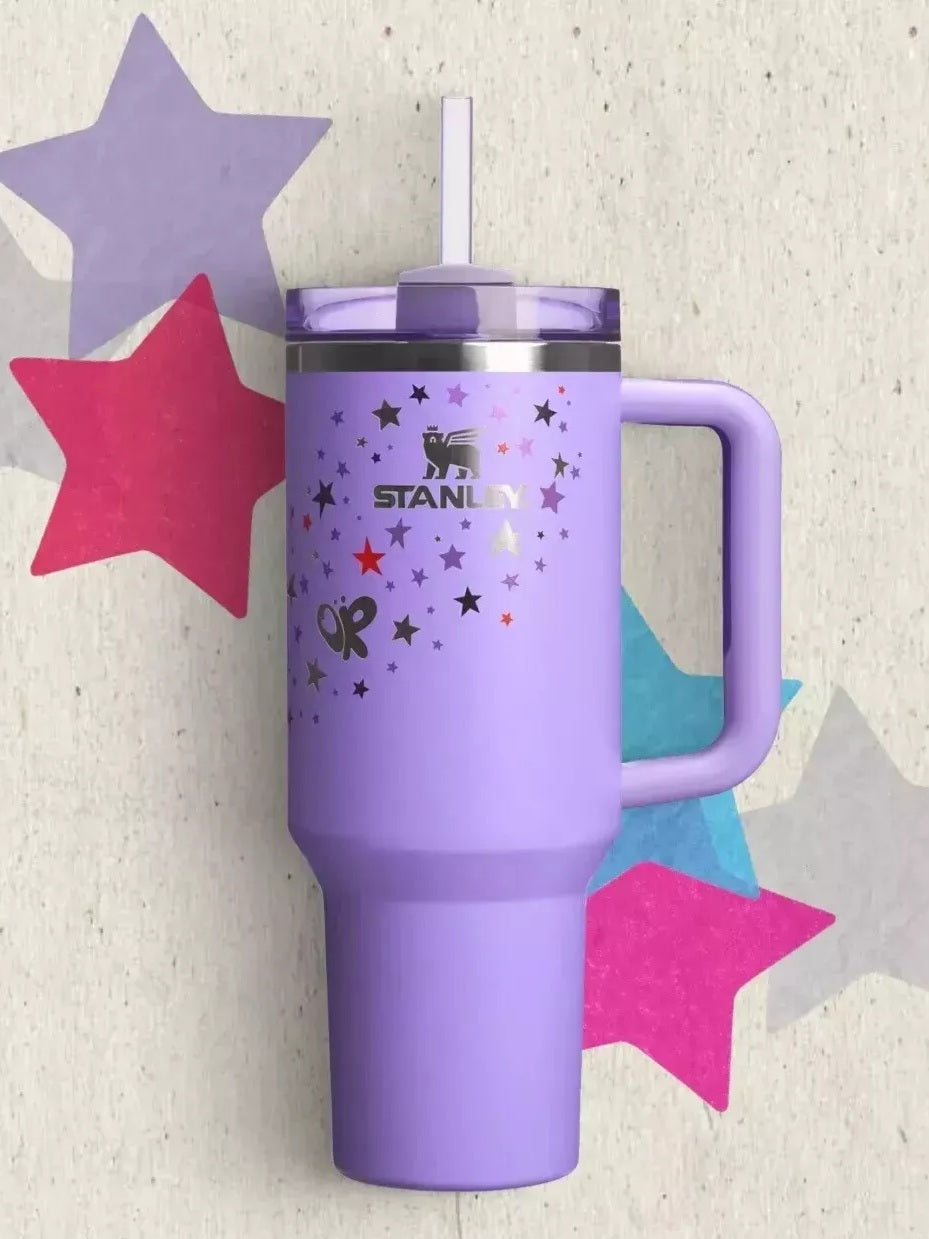 It features a stainless steel rim. double-wall insulation. and a reusable straw. The exterior of the tumbler is purple. accented by red and silver stars giving a cheerful aesthetic.