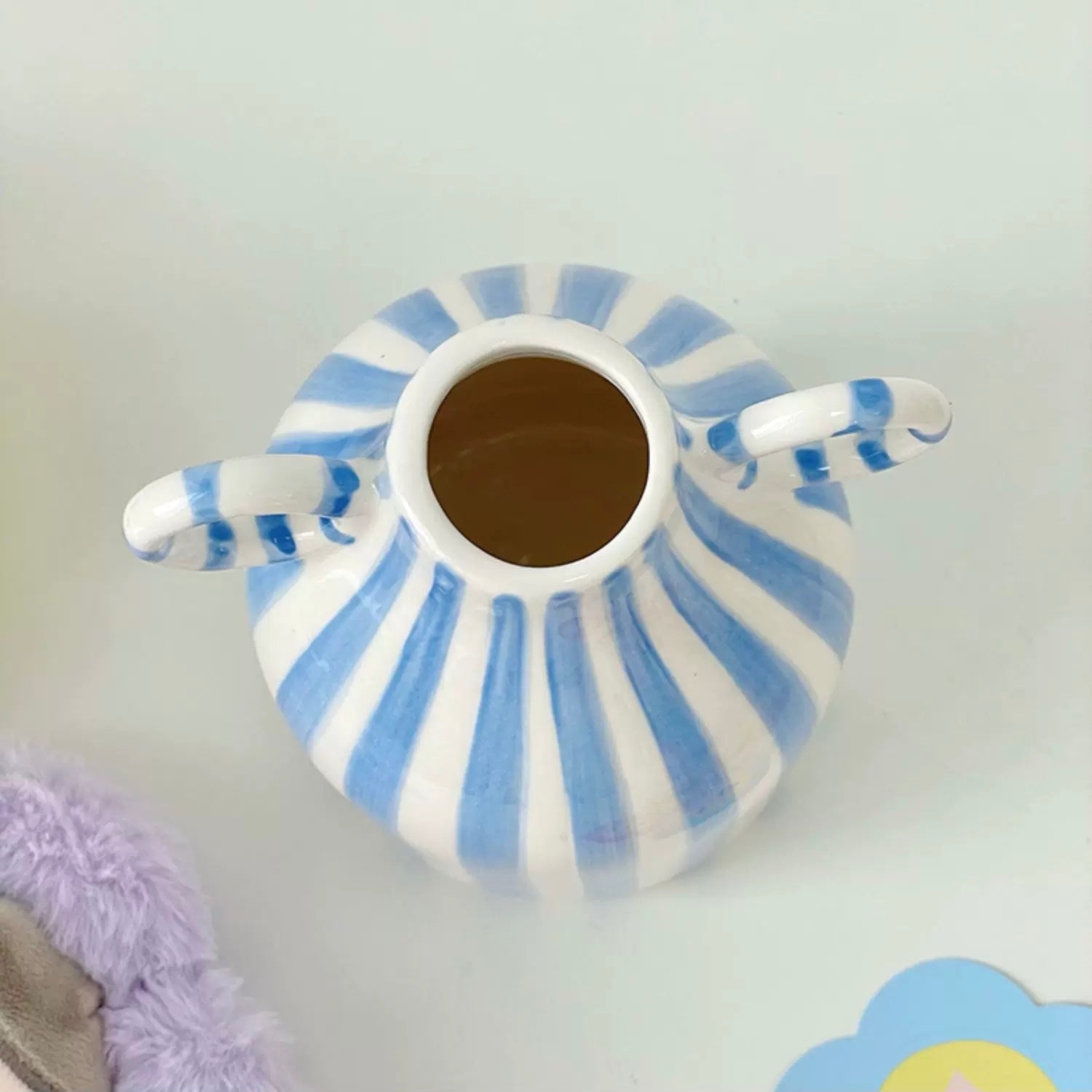 Bring a pop of personality to your shelf or table with this hand-painted striped ceramic vase. With its Scandinavian charm. dopamine decor colors. and playful double-handle design. it's the statement piece you didn't know your room needed. Perfect for soft pastel interiors. Pinterest-inspired shelf styling. and floral DIYs that brighten your mood 🌼