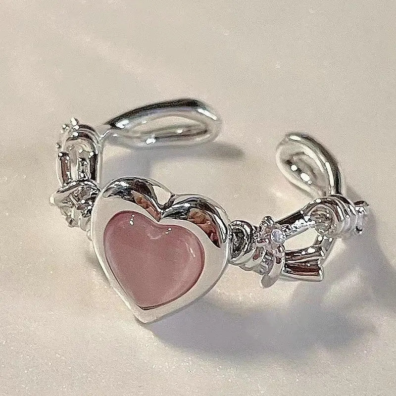 This ring is crafted in silver-toned metal. it features a delicate heart-shaped pink gemstone that captures attention.