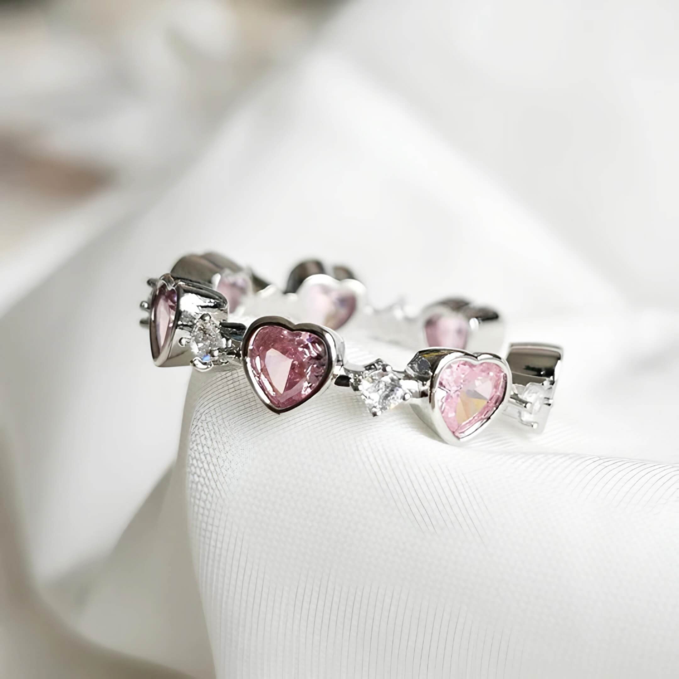 This exquisite ring features alternating pink heart-shaped gemstones intricately arranged for a spellbinding display of elegance and romance.