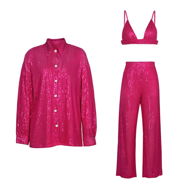 Party season just got a little chicer. This Bright Sequin set consists of a shirt. bralette top. and pants. All made from an ultra-glam sequin-embellished fabric. Wear them separately or as a set.