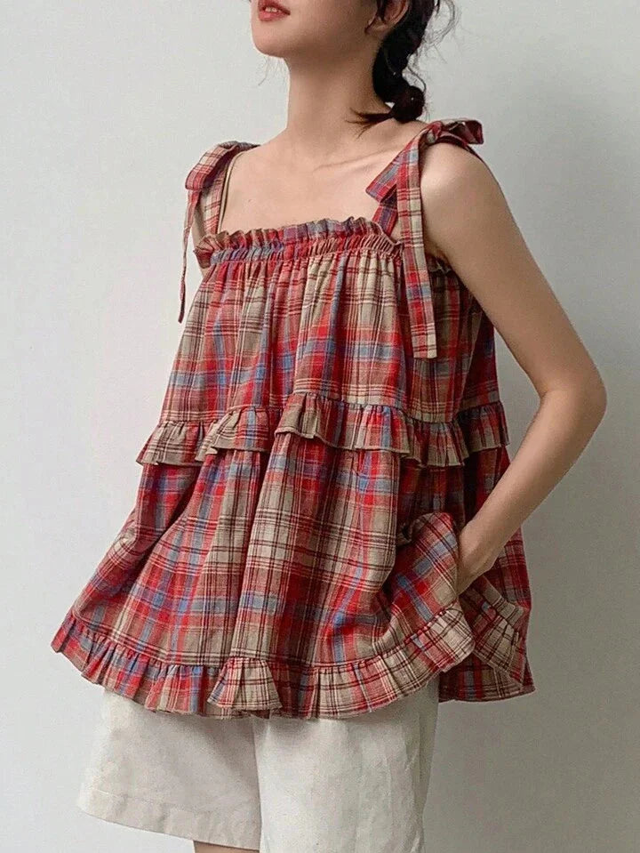 This stylish sleeveless top features a charming plaid pattern. flared silhouette. and lightweight fabric.
