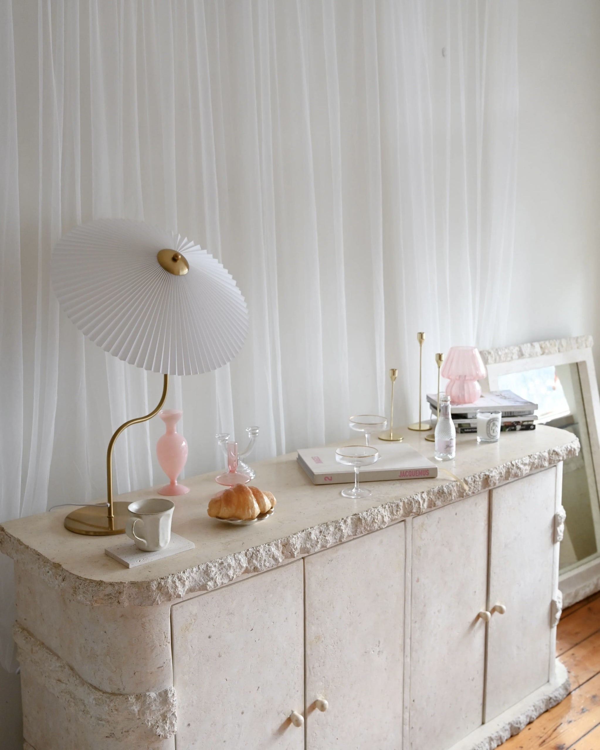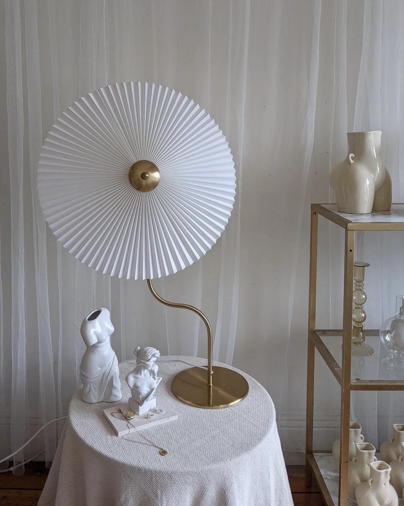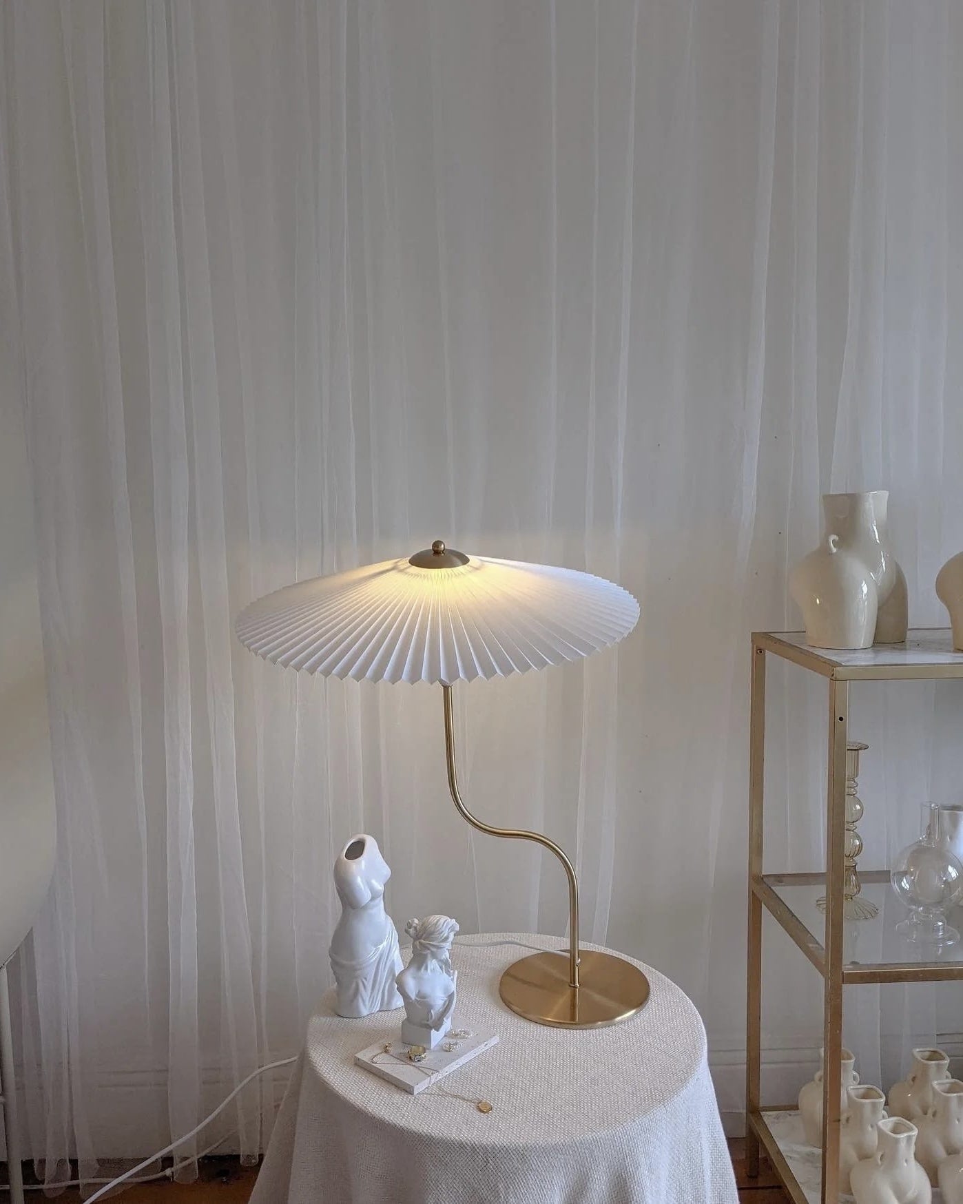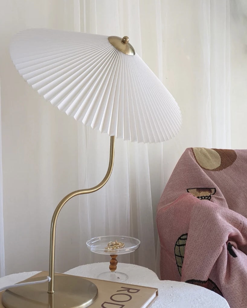 Enhance your home ambiance with our Vintage Pleated Brass Table Lamp. a perfect blend of retro European design and modern functionality. This stunning lamp features a large umbrella-shaped pleated lampshade crafted from high-quality brass. adding a touch of elegance to any living room. bedroom. or study desk. The swing simple European design complements various interior styles. from Japanese style to aesthetic soft girl room decor. Equipped with LED lighting. this pleated brass lamp offers energy-efficient illumination. creating a warm and inviting atmosphere.