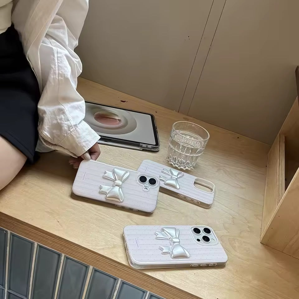 Sweet coquette-core with a glossy finish: clean white. tiny pink dots. and a raised pearl bow that looks amazing in mirror selfies. desk flatlays. and coffee runs.