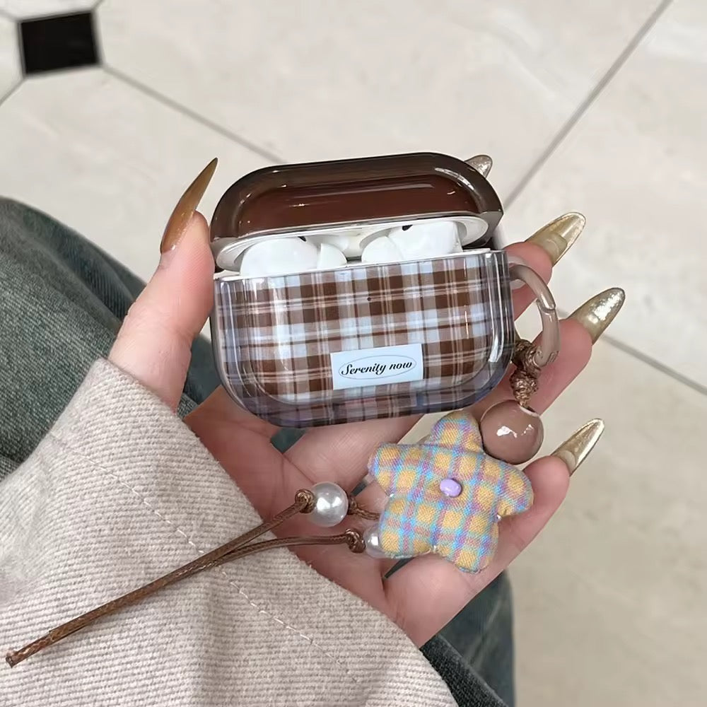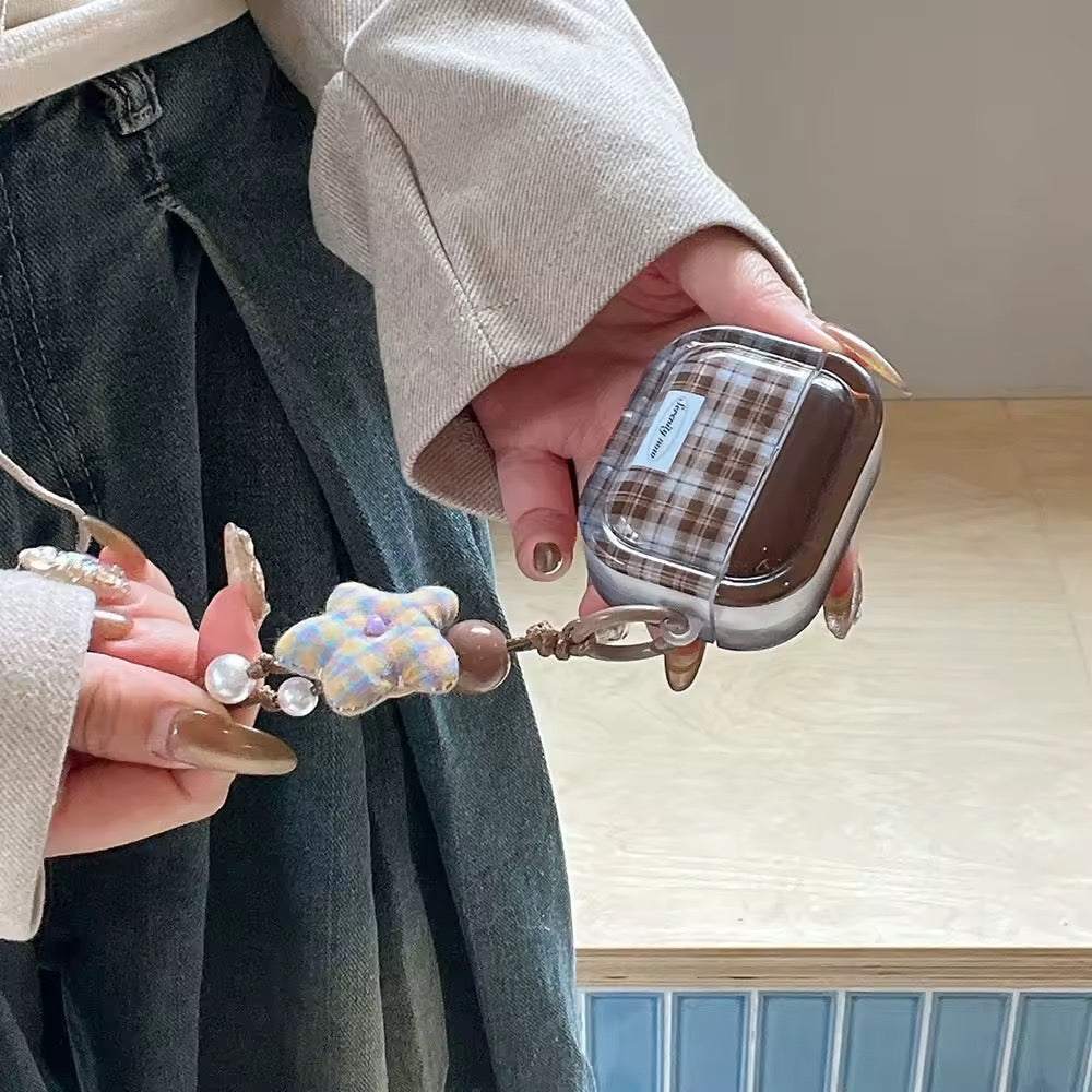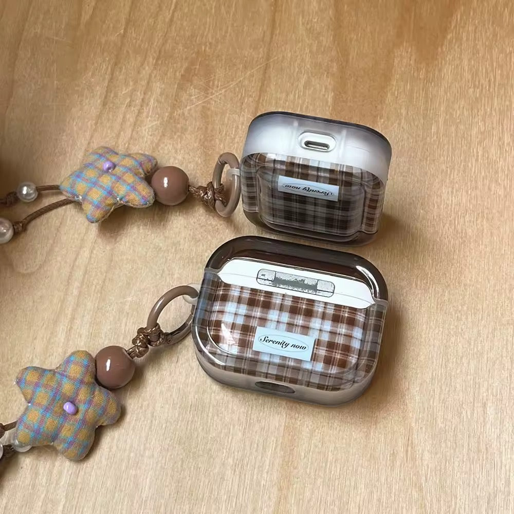 This cozy plaid AirPods case is a fall must-have for anyone living the preppy or soft girl aesthetic. Made from soft silicone. it snugly fits AirPods 1. 2. 3. Pro. and Pro 2 models. The brown grid pattern gives off retro schoolcore vibes while the plush star keychain adds charm and personality to your tech. Whether you're heading to class. journaling at your dorm desk. or matching your AirPods with your iPad setup. this case completes the look.