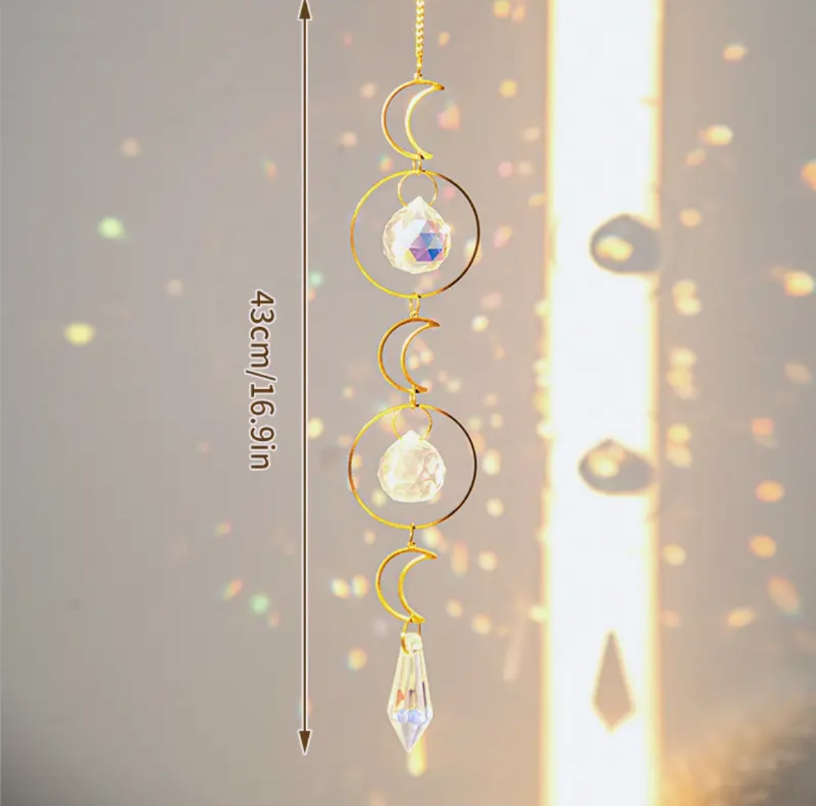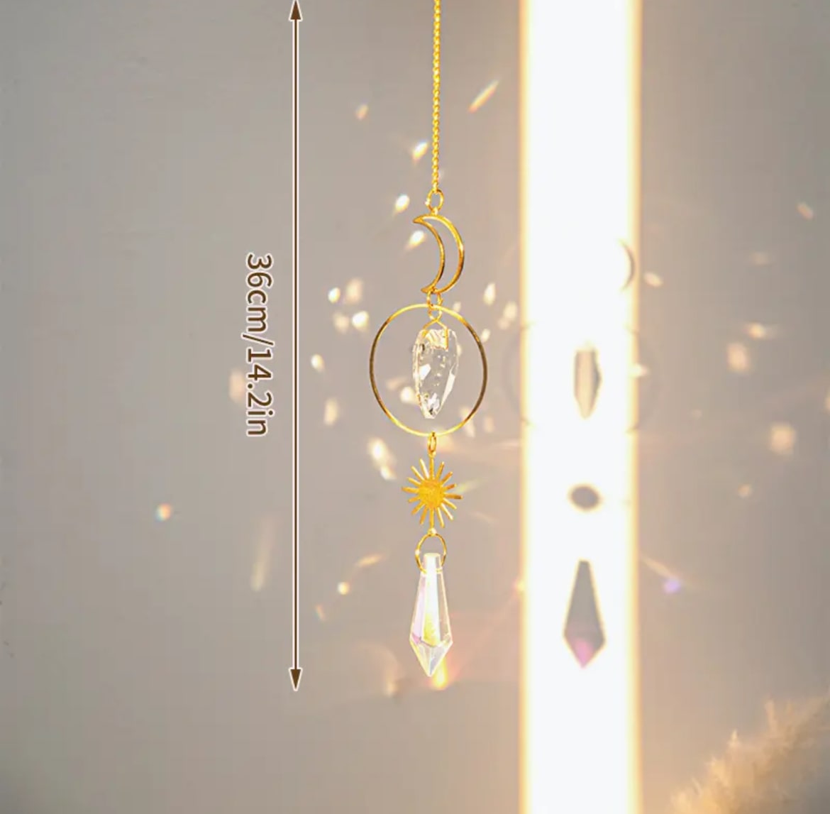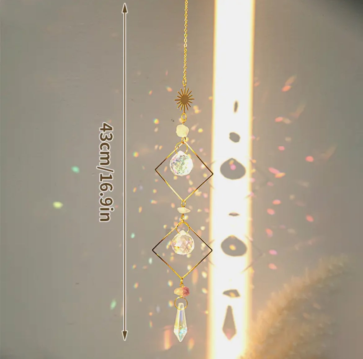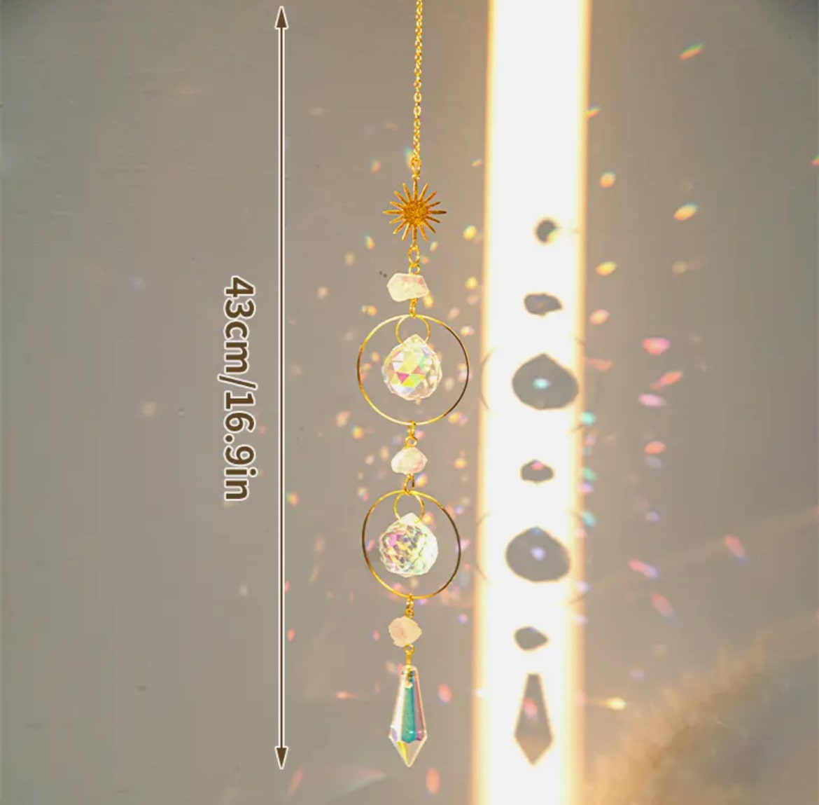 Elevate your space with our Crystal Prism Sun Catcher Window Hanger. a stunning piece that transforms sunlight into a mesmerizing aura rainbow. Crafted with high-quality prism crystals and multi-colored crystals. this boho decor rainbow maker prism strand adds a touch of magic to any room. The hanging gold spiral hoop design not only serves as a beautiful sun catcher but also as an elegant piece of dopamine decor that enhances your mood. Perfect for bedroom decor. this light catcher brings harmony and positive energy into your home.