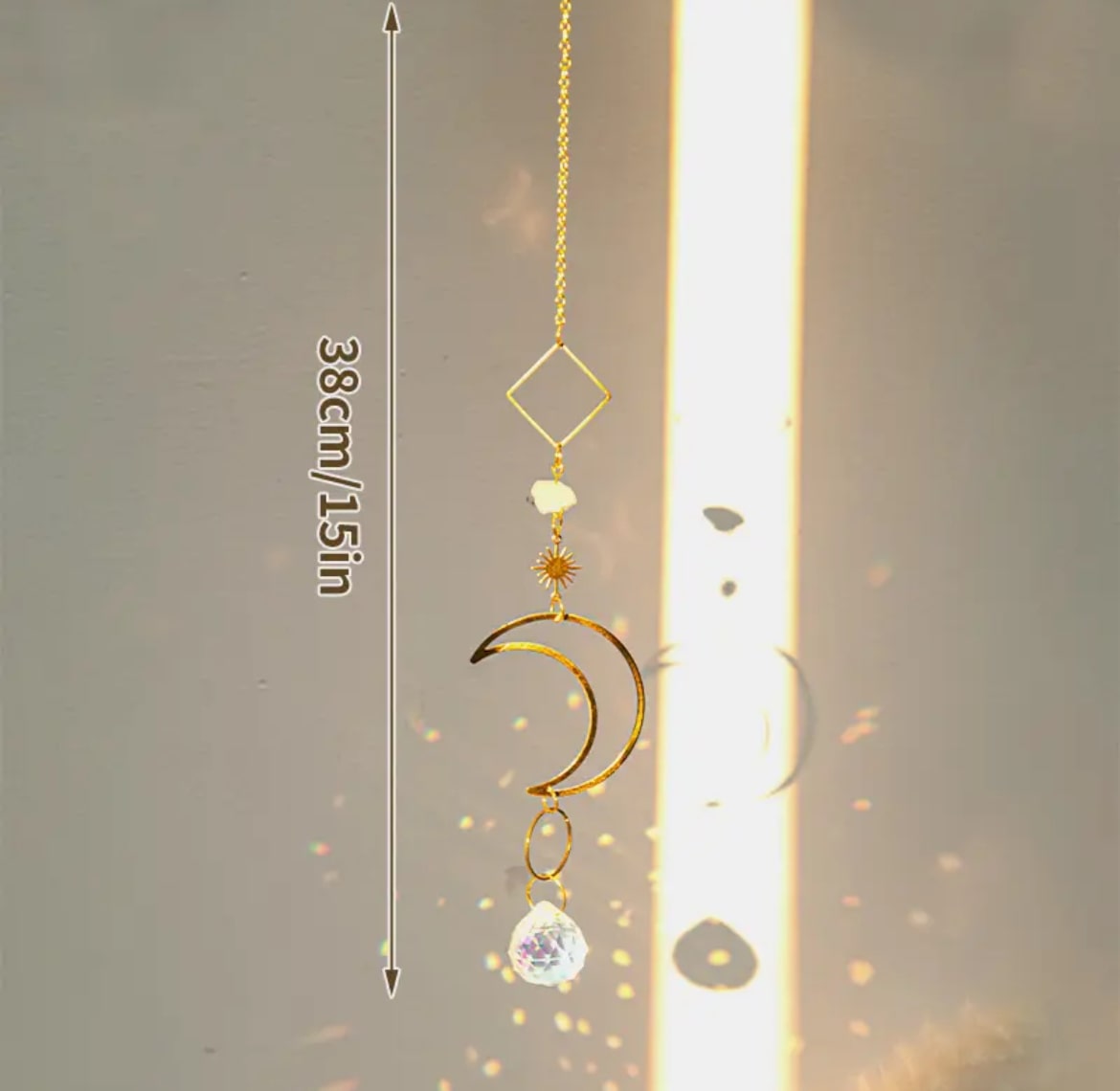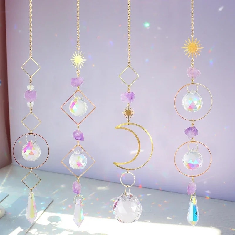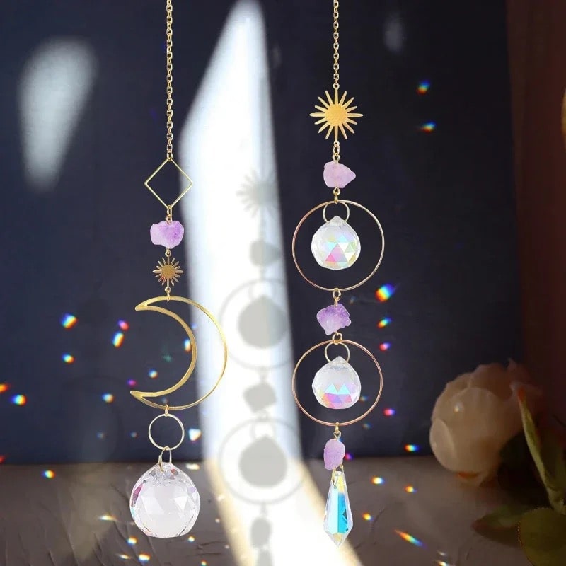 The amethyst crystal moon suncatcher is an exquisite addition. making it a unique and thoughtful gift for her or a special bridesmaid gift suncatcher. Hang it in your window. garden. or any space where light can catch the prism crystals. and watch as it creates a cascade of rainbows. Our hanging crystal suncatcher is not just a decorative piece but a symbol of beauty and positivity. Experience the joy of a colorful hanging crystal window prism and let the natural light fill your space with vibrant colors.