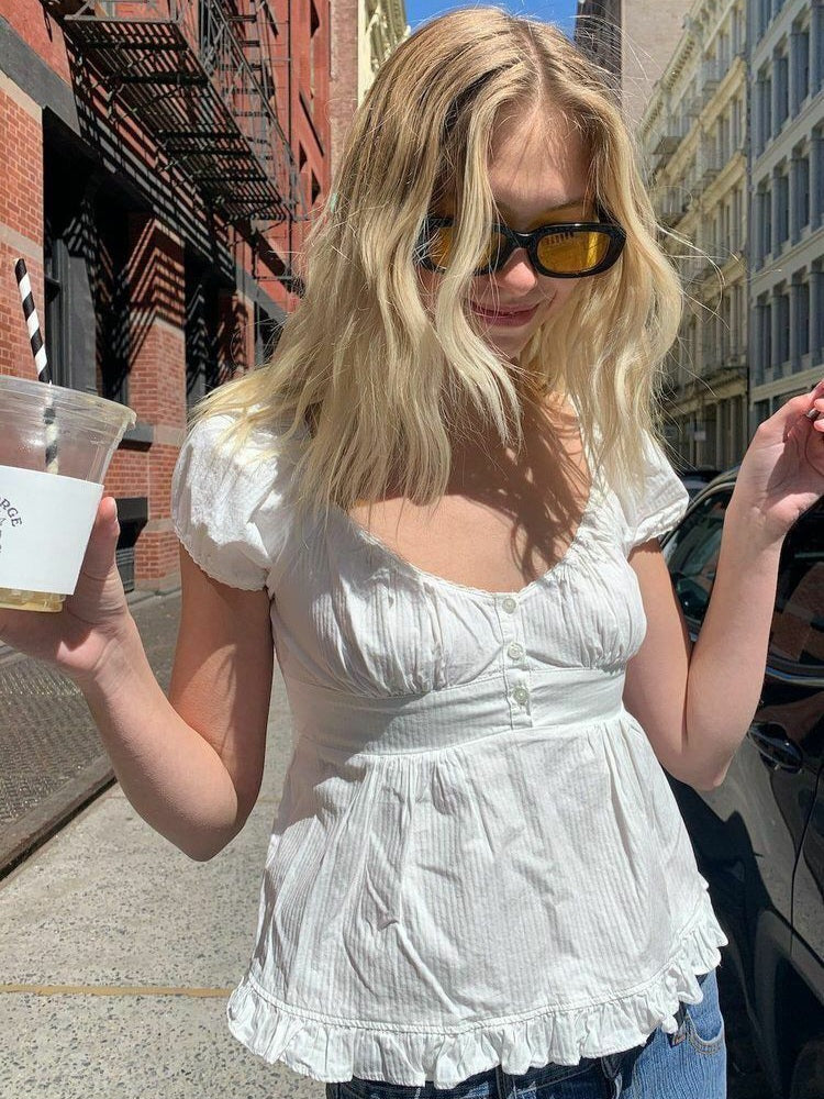 This short-sleeved top features a seam under the bust. three button-down detailing and pleated hem.