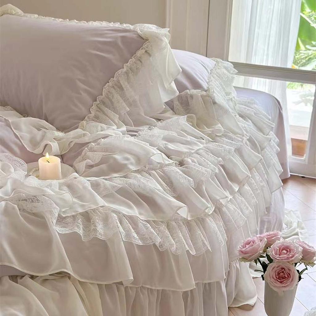 Turn your bedroom into a dreamy. romantic escape with our stunning ruffle duvet cover. Layers of delicate chiffon ruffles cascade like a waterfall. adding a magical touch to your space. Designed for those who love a bit of romance. this bedding set wraps you in soft. luxurious comfort. making every night feel like a love story.