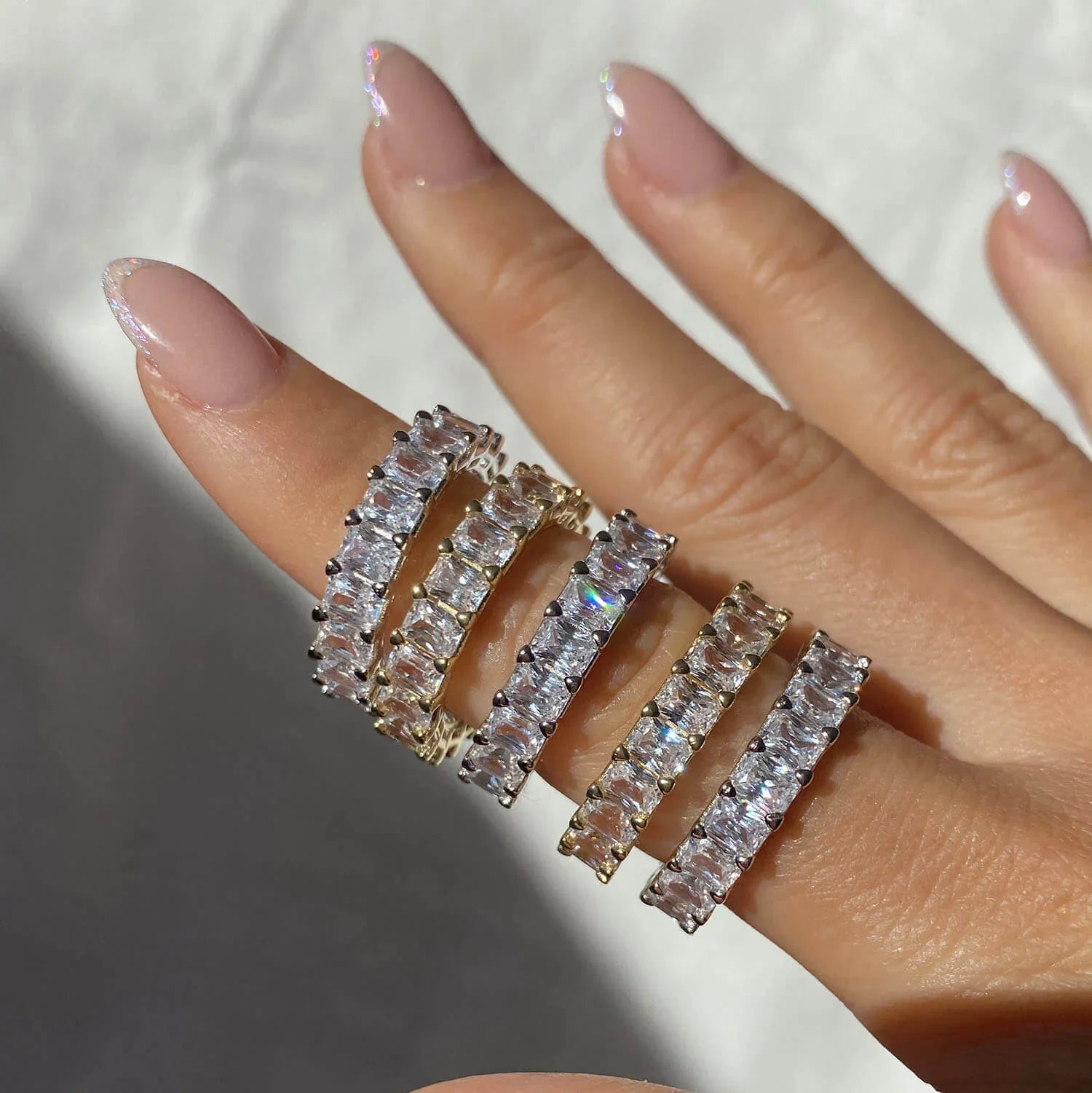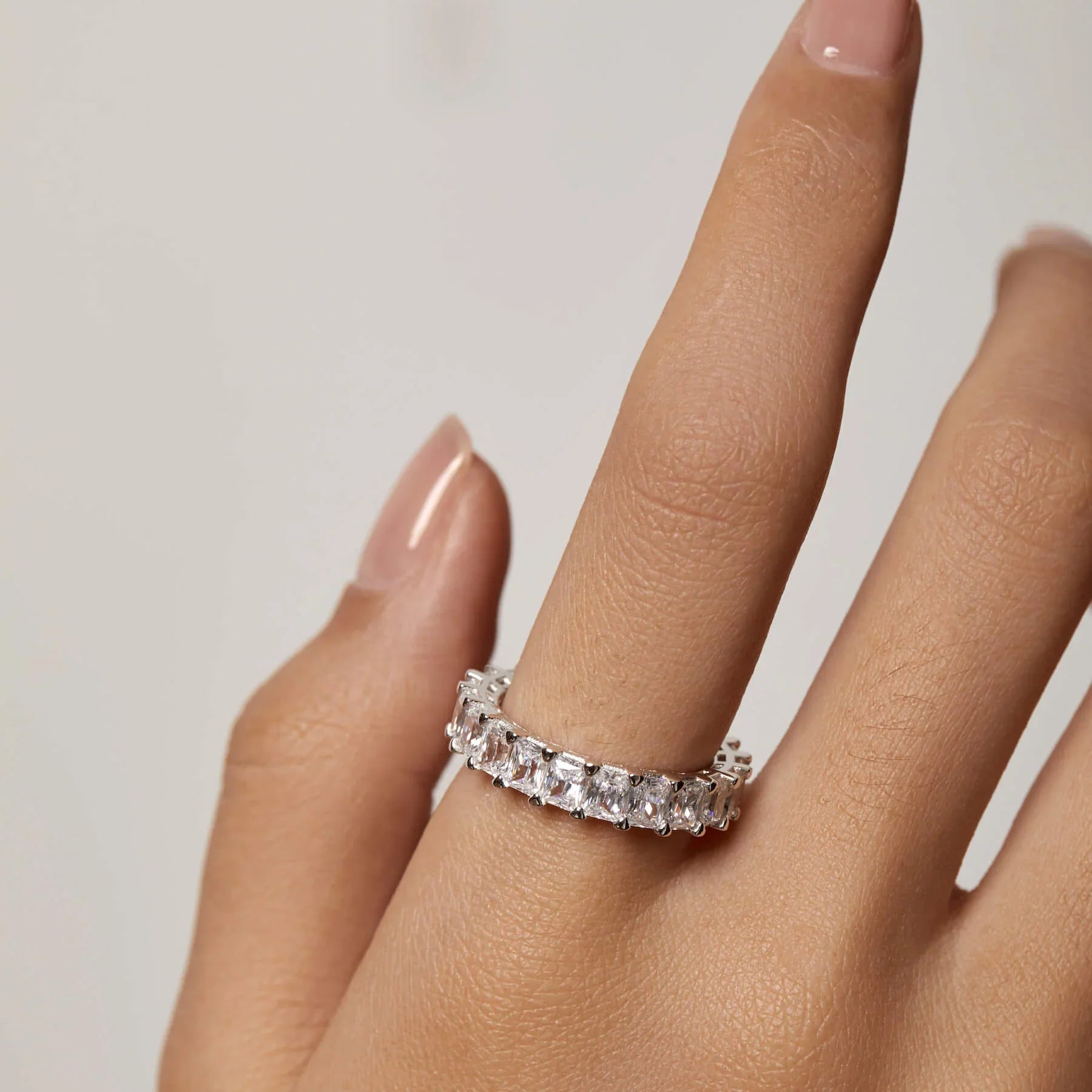 Prepare to elevate your style with the stunning Raine Ring. a radiant stone eternity band that radiates timeless charm. Each stone is carefully set in a continuous circle. creating a captivating play of light that mesmerizes everyone who sees it.