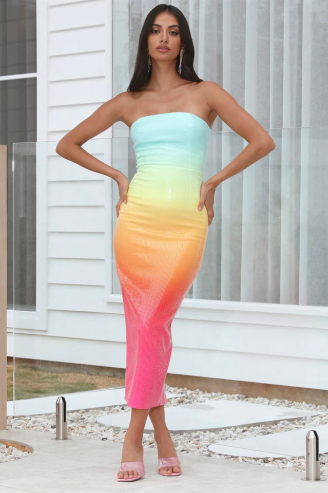Take your sexiness to the extreme with the Regina Multicolored Sequin Bodycon Dress. The strapless design accentuates the shoulders and neckline. and the high rise adds texture and defines the waistline. Ombre sequined fabric hugs the body tightly. This piece will make you sparkle under the lights. perfect for party events. Wear it with heels for a chic yet effortless look.