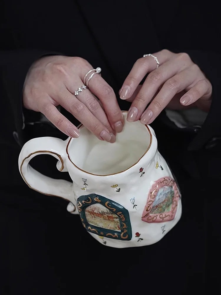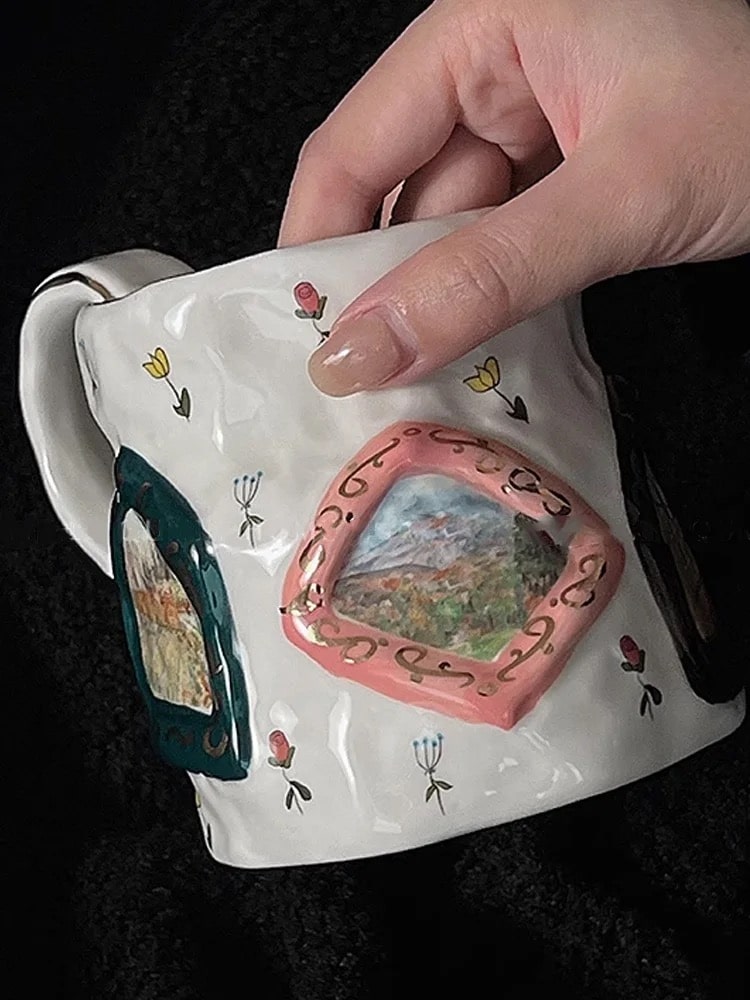 Add elegance to your morning routine with this Retro Ceramic Mug. a perfect blend of hand-painted artistry and modern functionality. Crafted with care. this large-capacity mug features unique gold-painted accents and an irregular design. making it both stylish and practical for your daily coffee. tea. or milk. The 3D printed window landscape design adds a charming and creative touch. making this mug not only a kitchen essential but also a decorative piece for your home or workspace.