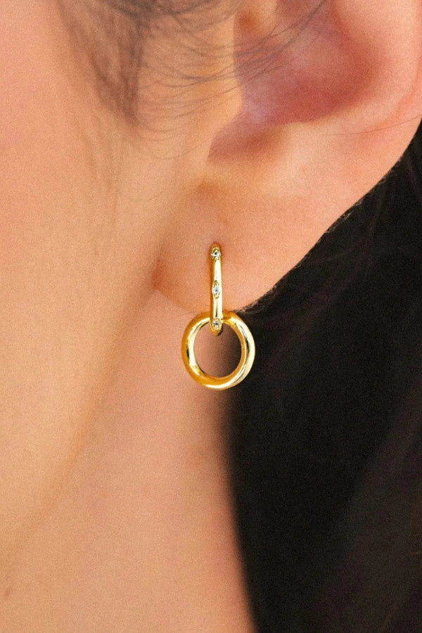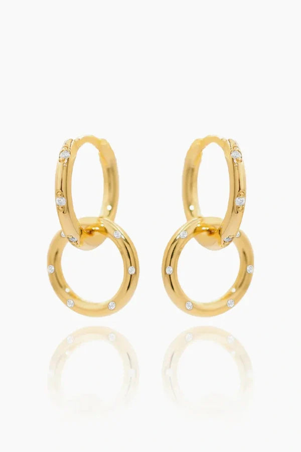 The Riana are a perfect blend of elegance and versatility. designed to elevate your everyday style. Crafted with thick 18K gold plating over eco-friendly brass. these earrings feature a unique intertwined design adorned with sparkling cubic zirconia stones. Hypoallergenic and lightweight. they offer both comfort and sophistication. With a detachable bottom link. you can customize your look for a minimalist or statement-making finish. Ideal for any occasion. the Riana are a timeless addition to your jewelry collection.