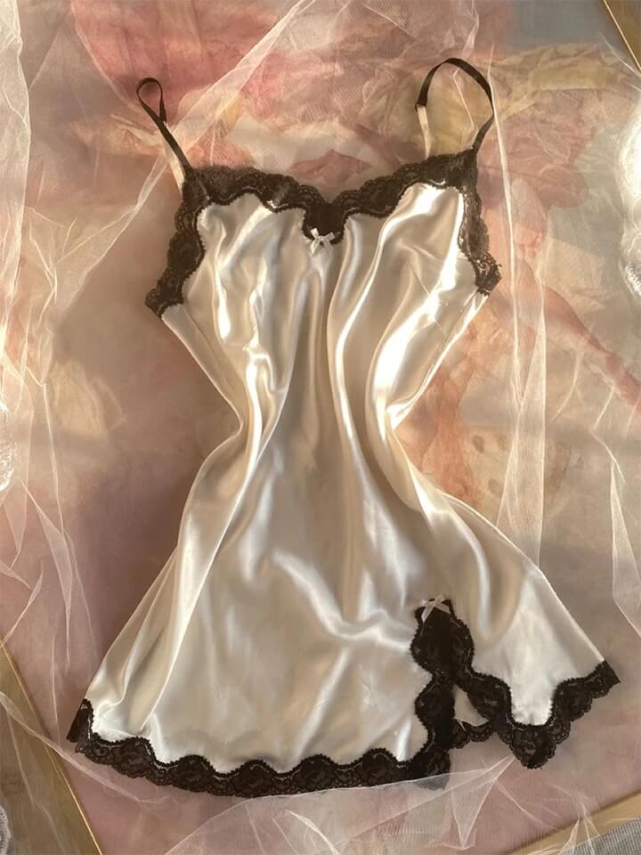The satin slip nightgown has lace detailing and features thin shoulder straps. with elegant lace accents along the neckline and hem. It's a type of lingerie that combines both comfort and aesthetic appeal.