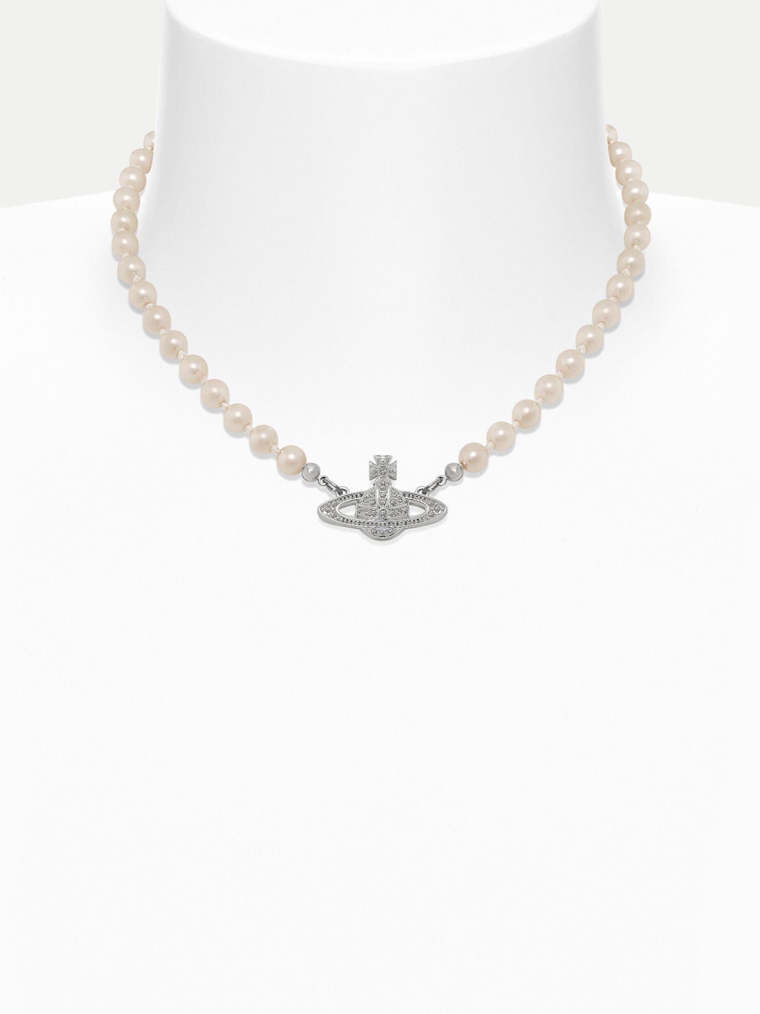 This pearl necklace is strung with a row of glass-based Swarovski pearls with an orb pendant in the centre.