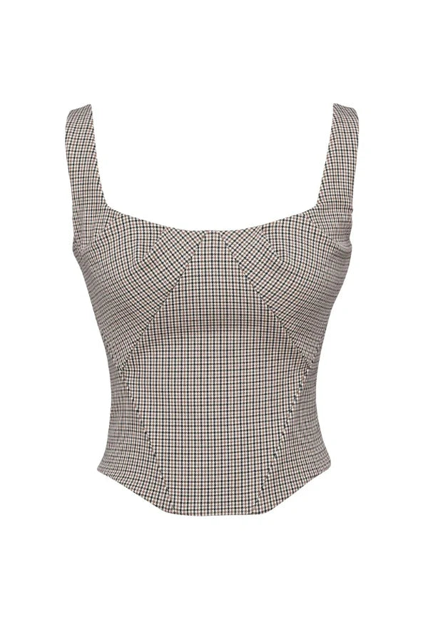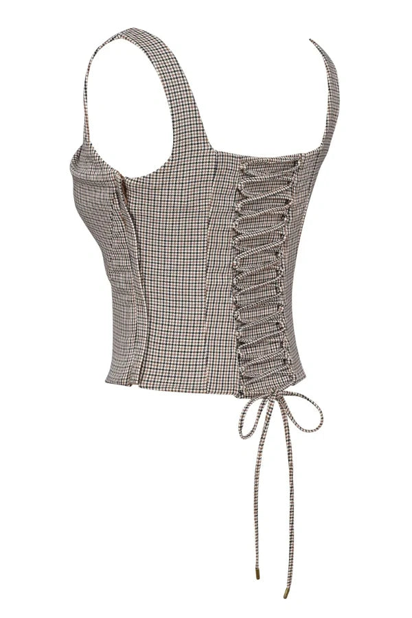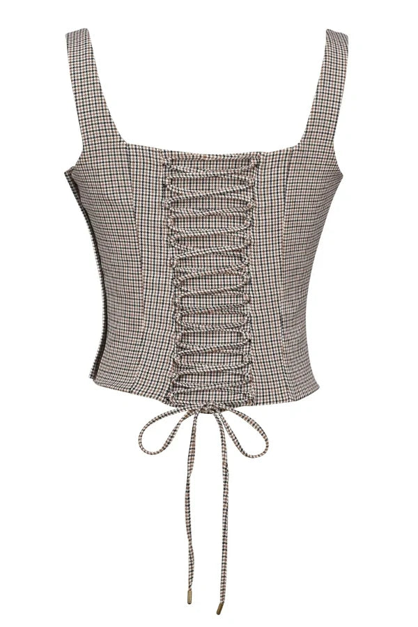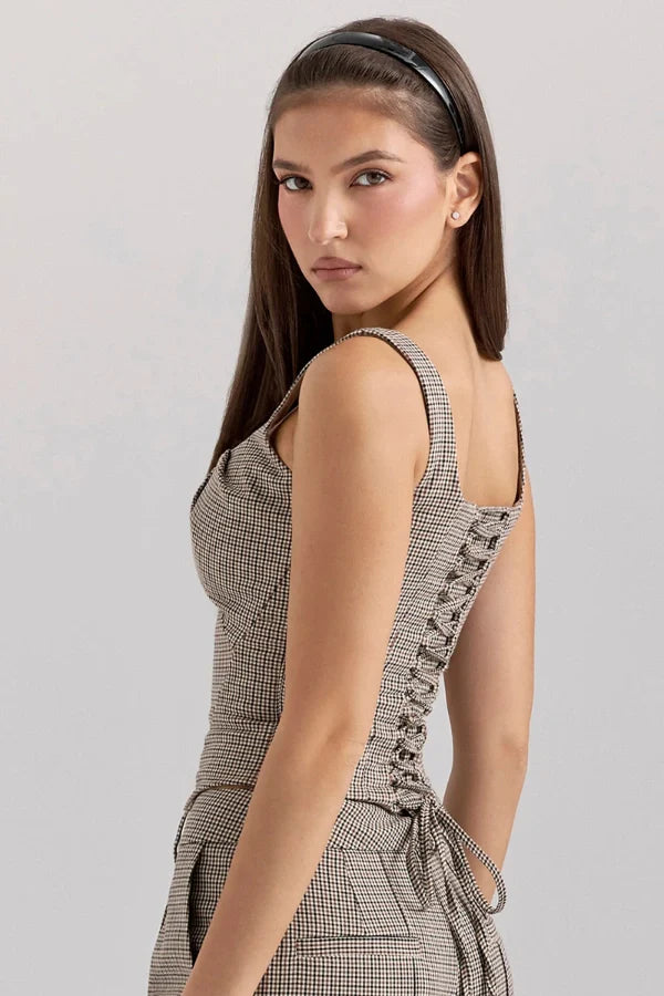 The 'Selmy' corset top exudes sophistication with its classic brown puppytooth pattern. Featuring boning for a cinched waist. a gathered bust for a flattering silhouette. an adjustable lace-up back. and a convenient side zipper. it seamlessly blends timeless elegance with contemporary functionality.