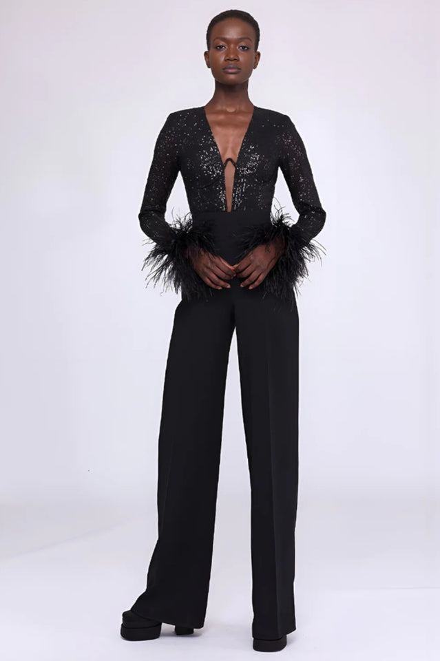 Transform into the life of the party with our Sequin Feather-Trim Cuff Jumpsuit! With its elegant black design. adorned with shimmering sequins and delicate feathers on the cuffs. you'll stand out in any crowd. Unleash your inner diva and make a statement at your next event!