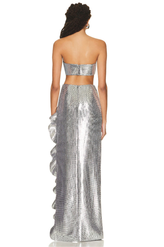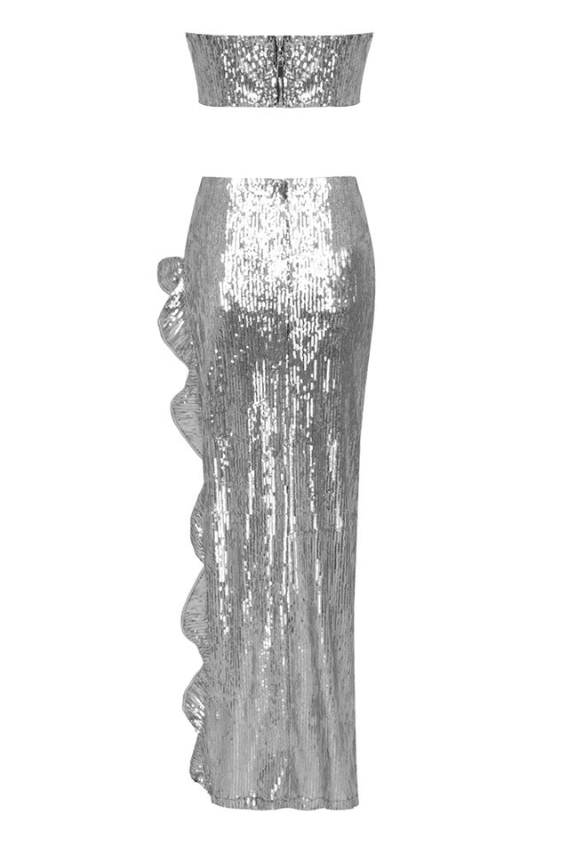 This new two-piece suit is perfect for a night out on the town! The sequined bandeau top is sure to turn heads. while the silver hue will make you shine. The slim-fit pants are comfortable and flattering. making this the perfect outfit for a night of dancing.