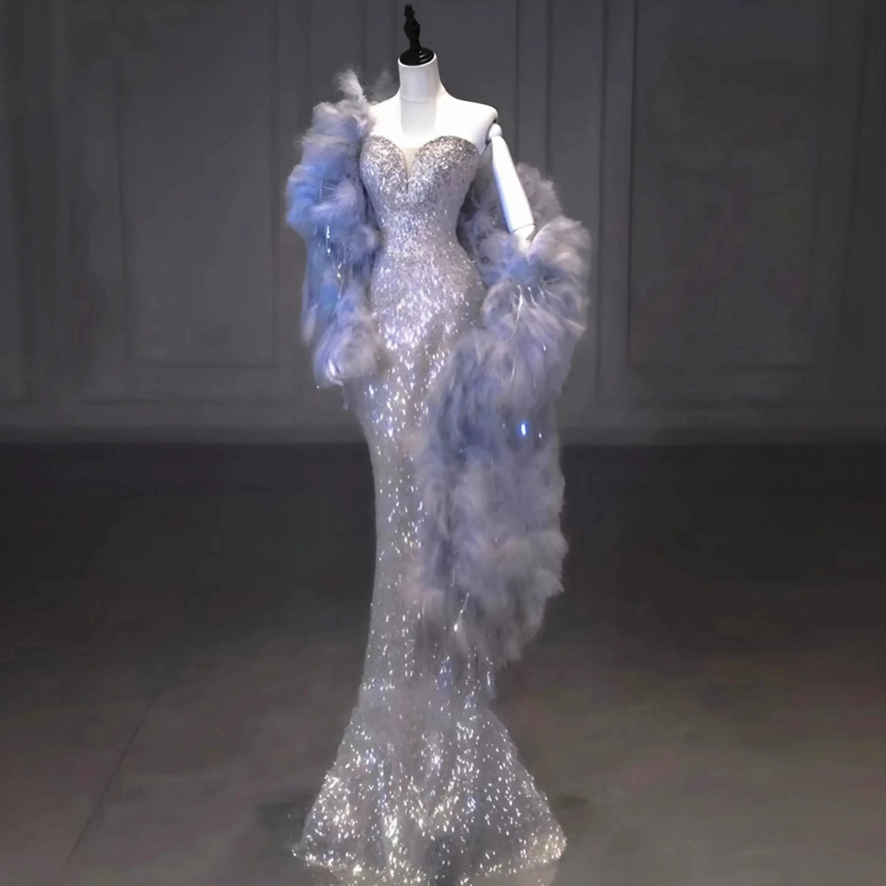 The Silver Sequin Tube Mermaid Dress is is a long silver evening gown with a fitted bodice that transitions into a flowing mermaid skirt.