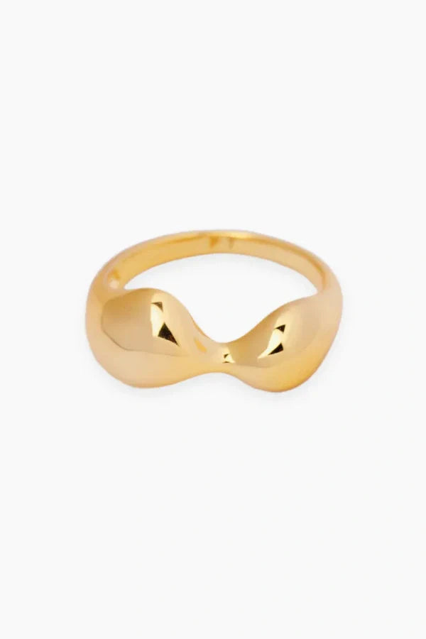 The Sinta Gold Ring is the perfect addition to any stylish ring stack. Crafted with thick 14K gold plating over brass. this hypoallergenic piece features an abstract silhouette inspired by the flowing beauty of liquid gold and melted honey. Its unique design exudes sophistication and charm. making it a must-have for anyone looking to elevate their jewelry collection with a touch of effortless elegance.