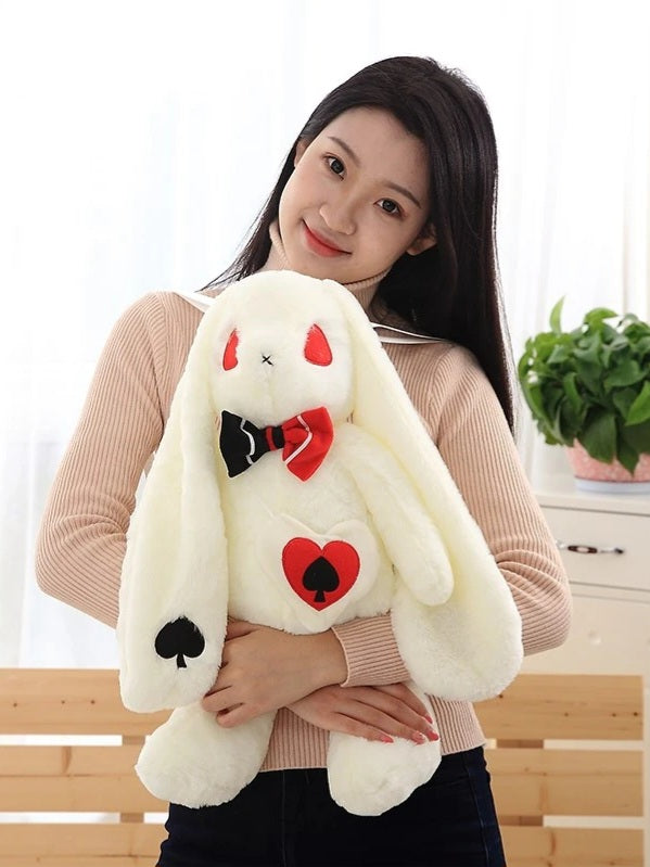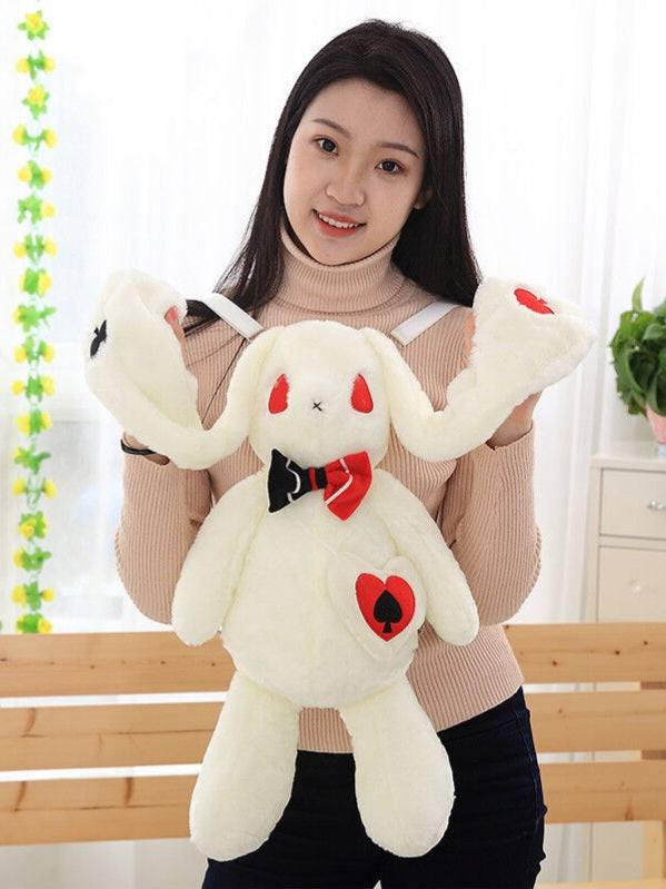 This bunny backpack features a soft. fluffy white exterior with red and black spades on the ears and feet.
