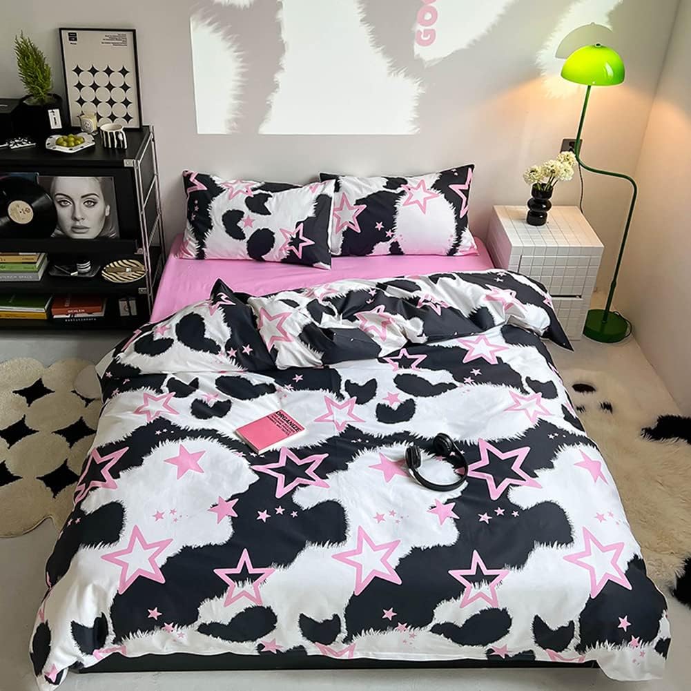 This bedding set features an eye-catching combination of classic cow print and playful pink stars to drift off into dreamland in style.